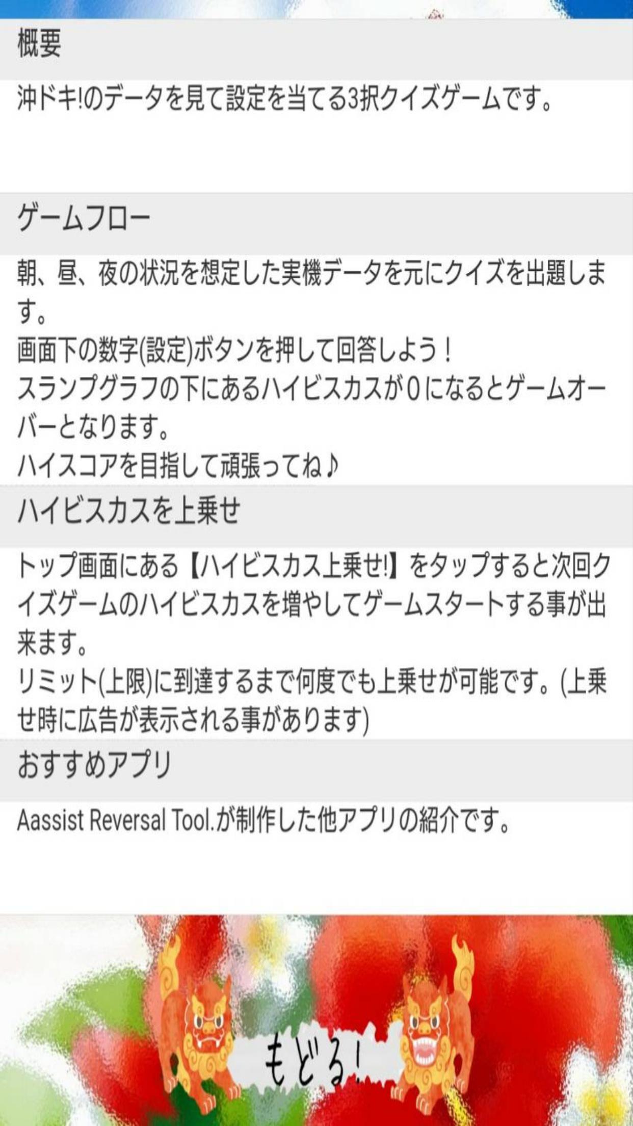本アプリケーションは沖ドキ!の実機データを元に作られたクイズゲームです。