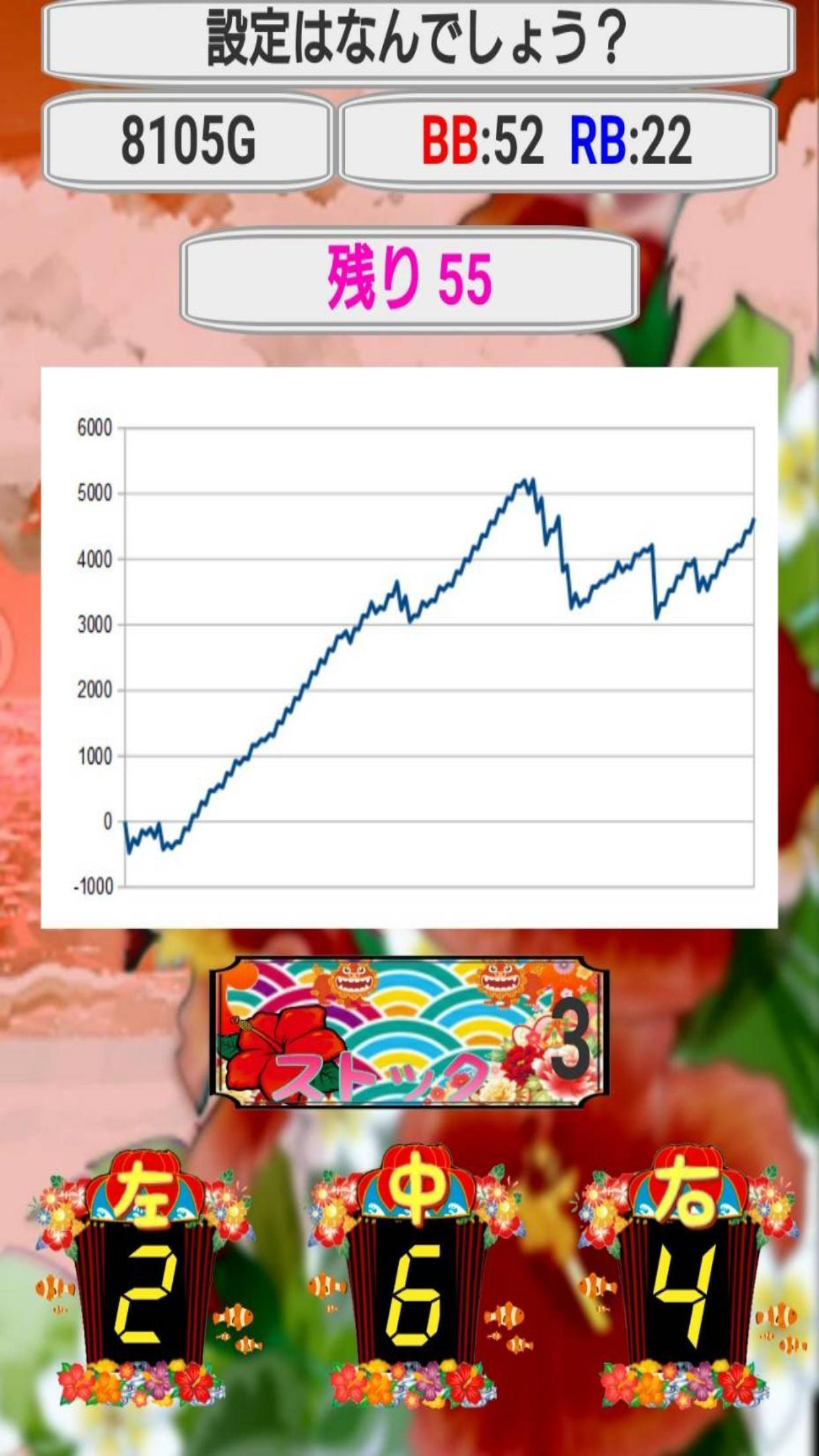 実際のホールでよく見かける様なデータで設定を推測して画面下の3つの回答ボタンを押して設定を当ててみてください!