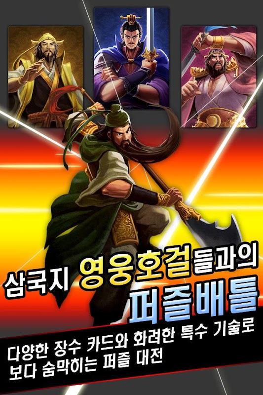 - 다양한 장수 카드와 화려한 특수 기술로 보다 숨막히는 퍼즐 대전!