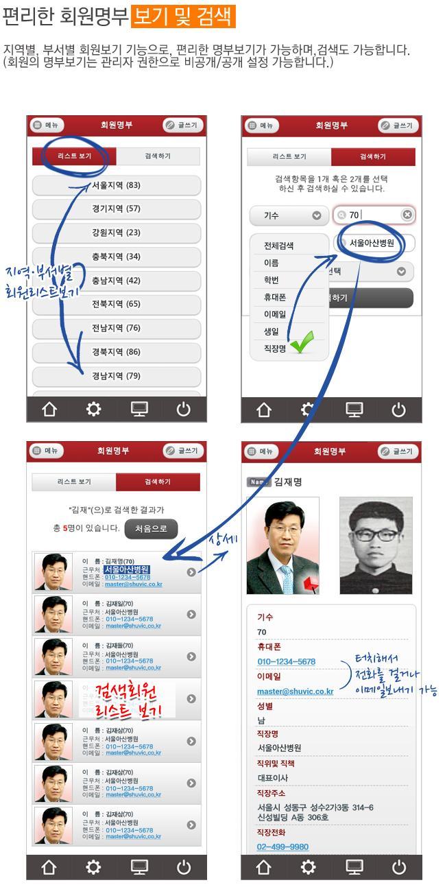6. 회원명부에서 회원을 검색, 선택하면 사진과 연락처를 볼 수 있으며 전화나 이메일을 선택하여 즉시 발송할 수 있습니다. (별도의 회원수첩 책자 불요)