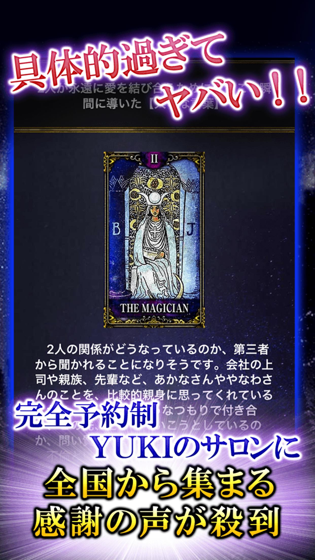 過去から今に至るまでの天体の動きからユーザーの本質的な気持ちをリーディングし、さらにタロットを用いた複合的な鑑定で精密に気持ちを当てる鑑定は、多くの芸能人から厚い信頼を受けてきた。