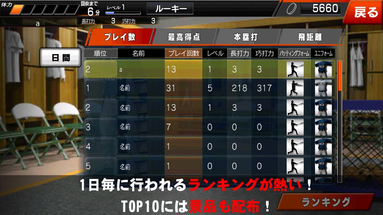・ランキングは、デイリー(毎日)でプレイ数、最高得点、本塁打、飛距離で競う。