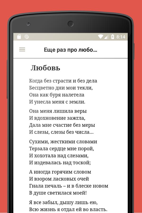 Мы собрали самые красивые стихи о любви выдающихся поэтов. В данном приложении есть стихи любимой девушке и стихи любимой жене. Также здесь вы сможете найти стихи любимому мужчине.
