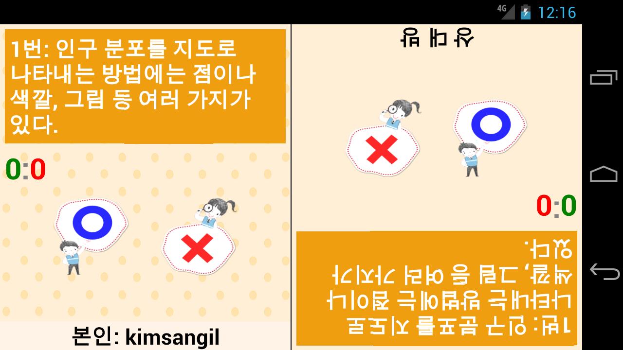 다. 사회 마주보기: 2인용으로서 스마트폰을 가운데 두고 친구와 마주앉아 퀴즈를 풀며 자신의 승율 쌓기