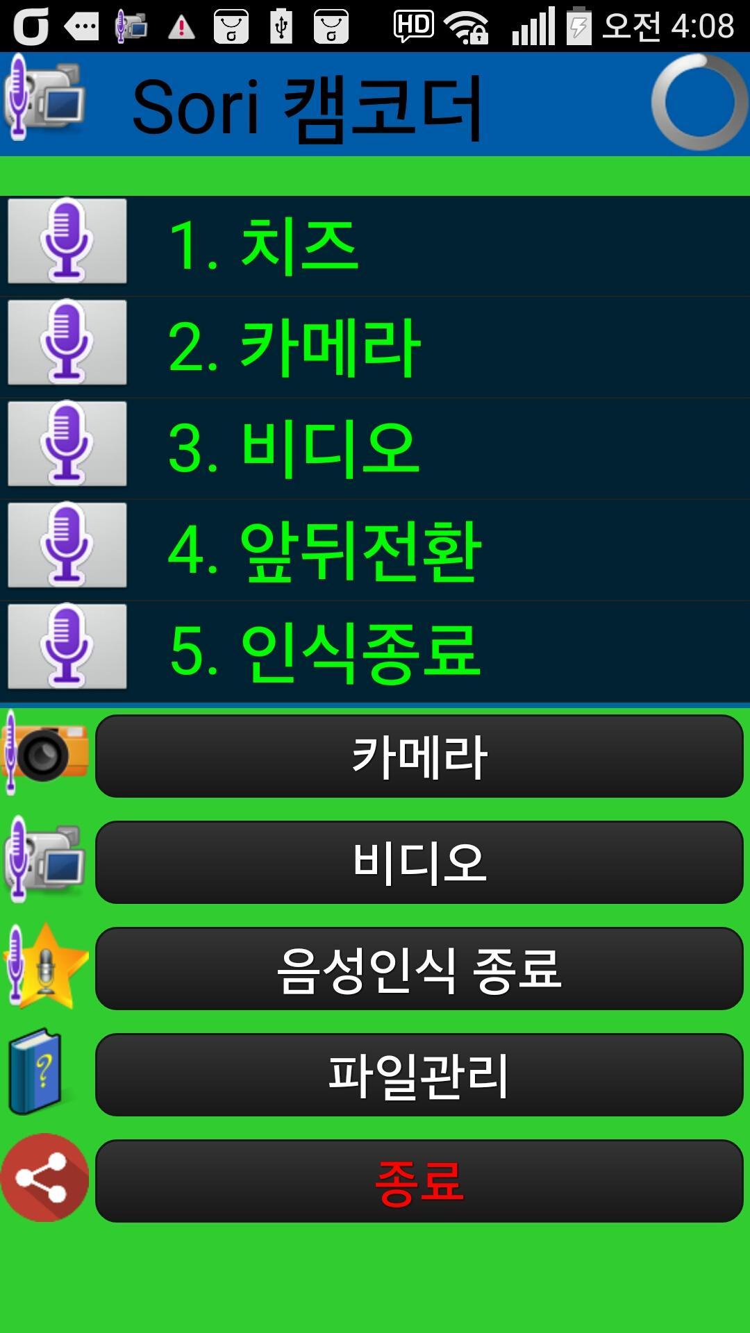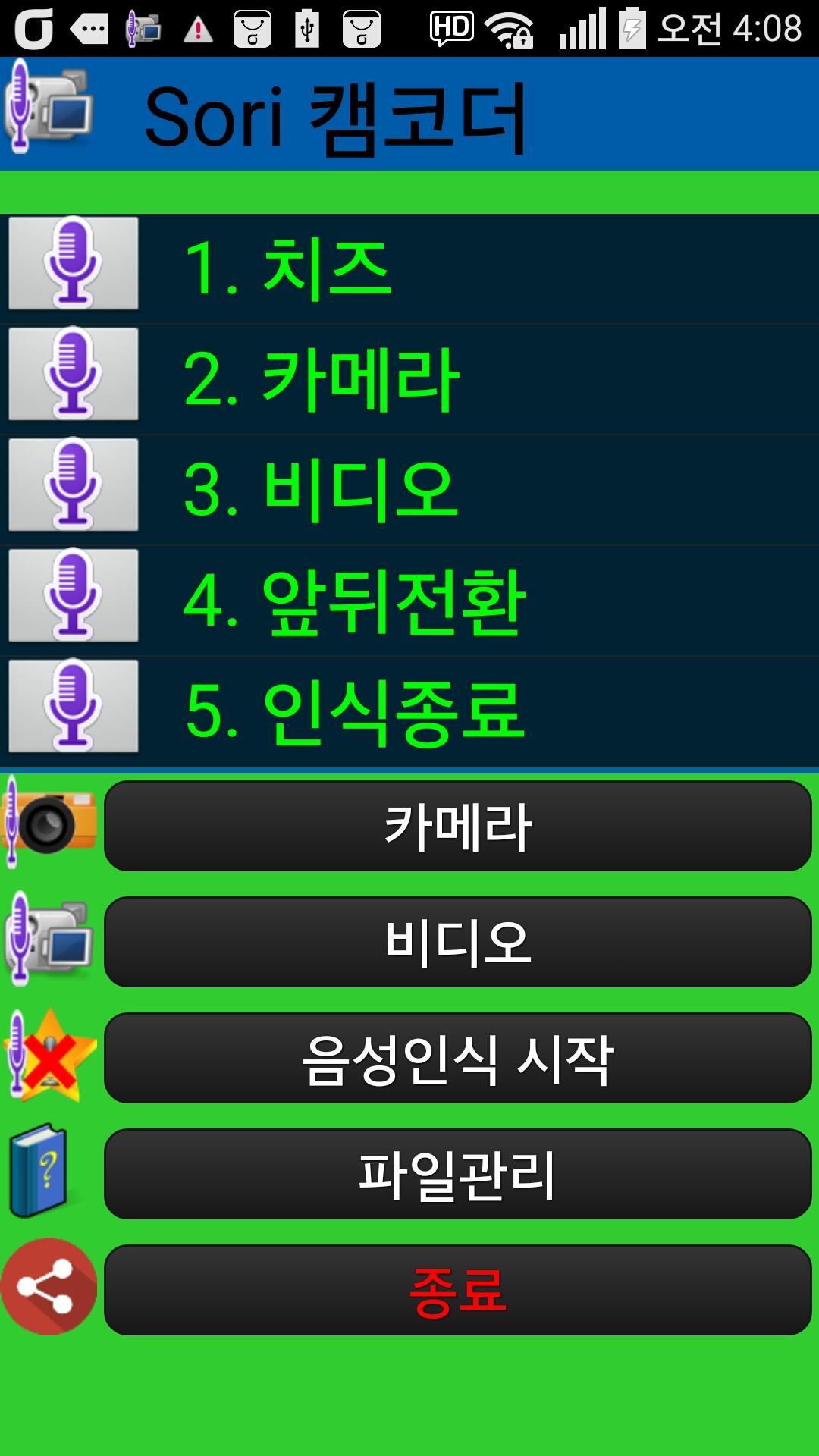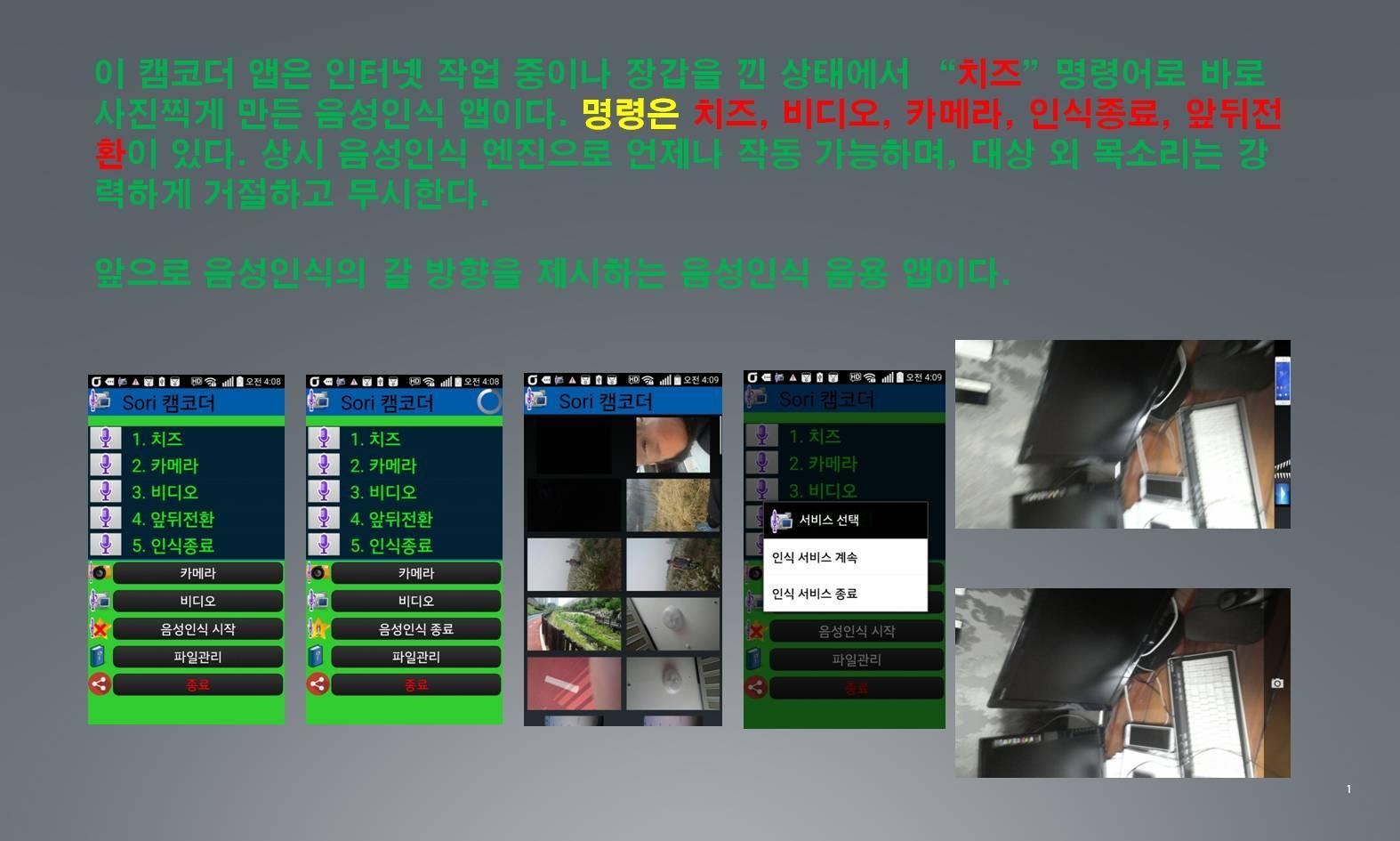 이 캠코더 앱은 인터넷 작업 중이나 장갑을 낀 상태에서 “치즈”명령어로 바로 사진찍게 만든 음성인식 앱이다. 명령은 치즈, 비디오, 카메라, 인식종료, 앞뒤전환이 있다. 상시 음성인식 엔진으로 언제나 작동 가능하며, 대상 외 목소리는 강력하게 거절하고 무시한다.