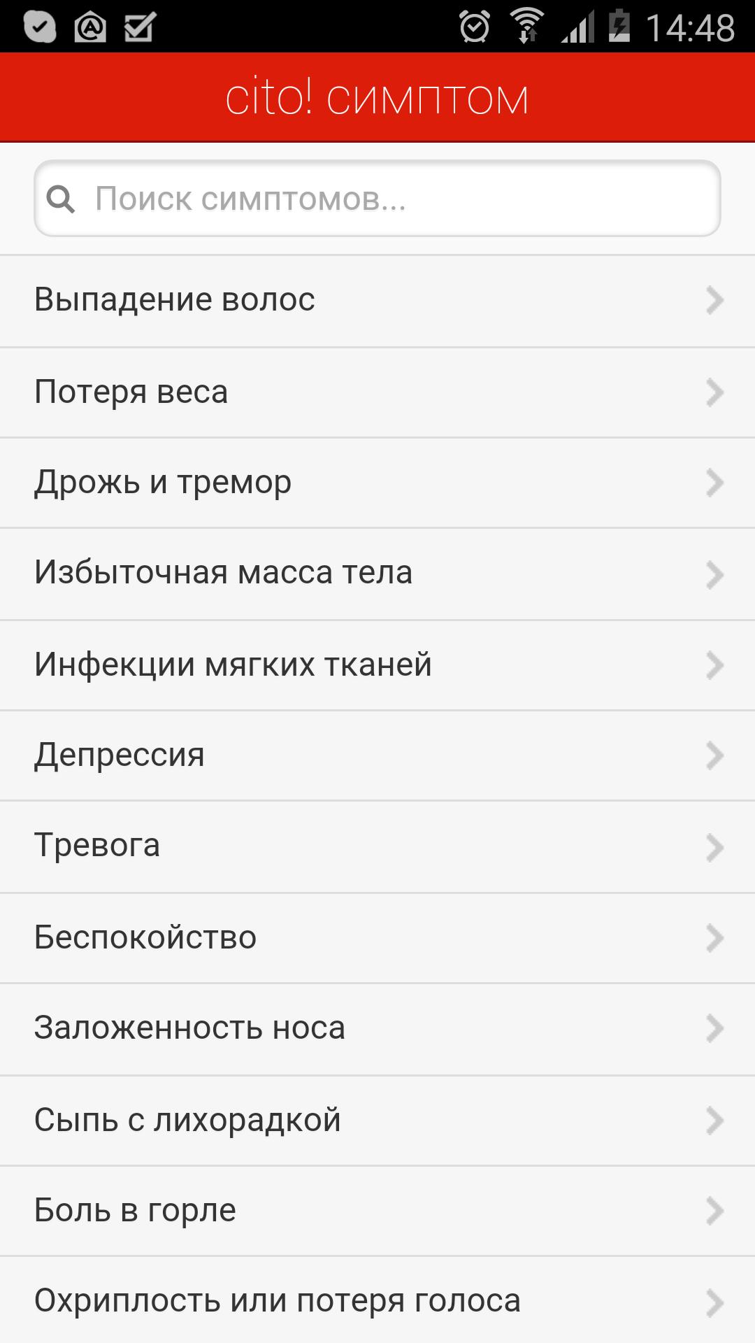 Каждое заболевание имеет свои определенные признаки, характерные внешние проявления – так называемые симптомы болезни. Определение симптомов – первый шаг в диагностике заболеваний в целом. В наем приложении собраны основные симптомы, с которыми все сталкиваются в сове жизни.