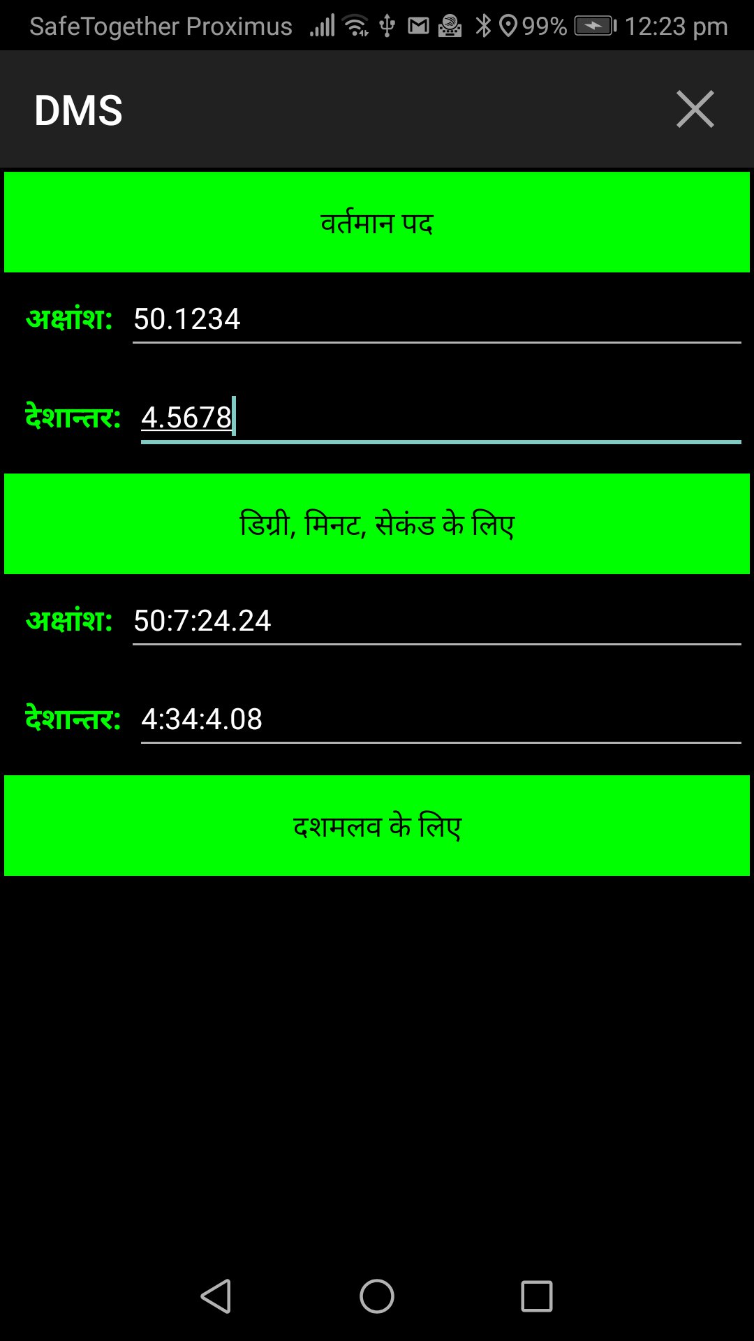 डीएमएस ऐप दशमलव और डिग्री, मिनट और सेकंड दोनों में एक दर्ज जीपीएस स्थिति प्रदर्शित करता है।