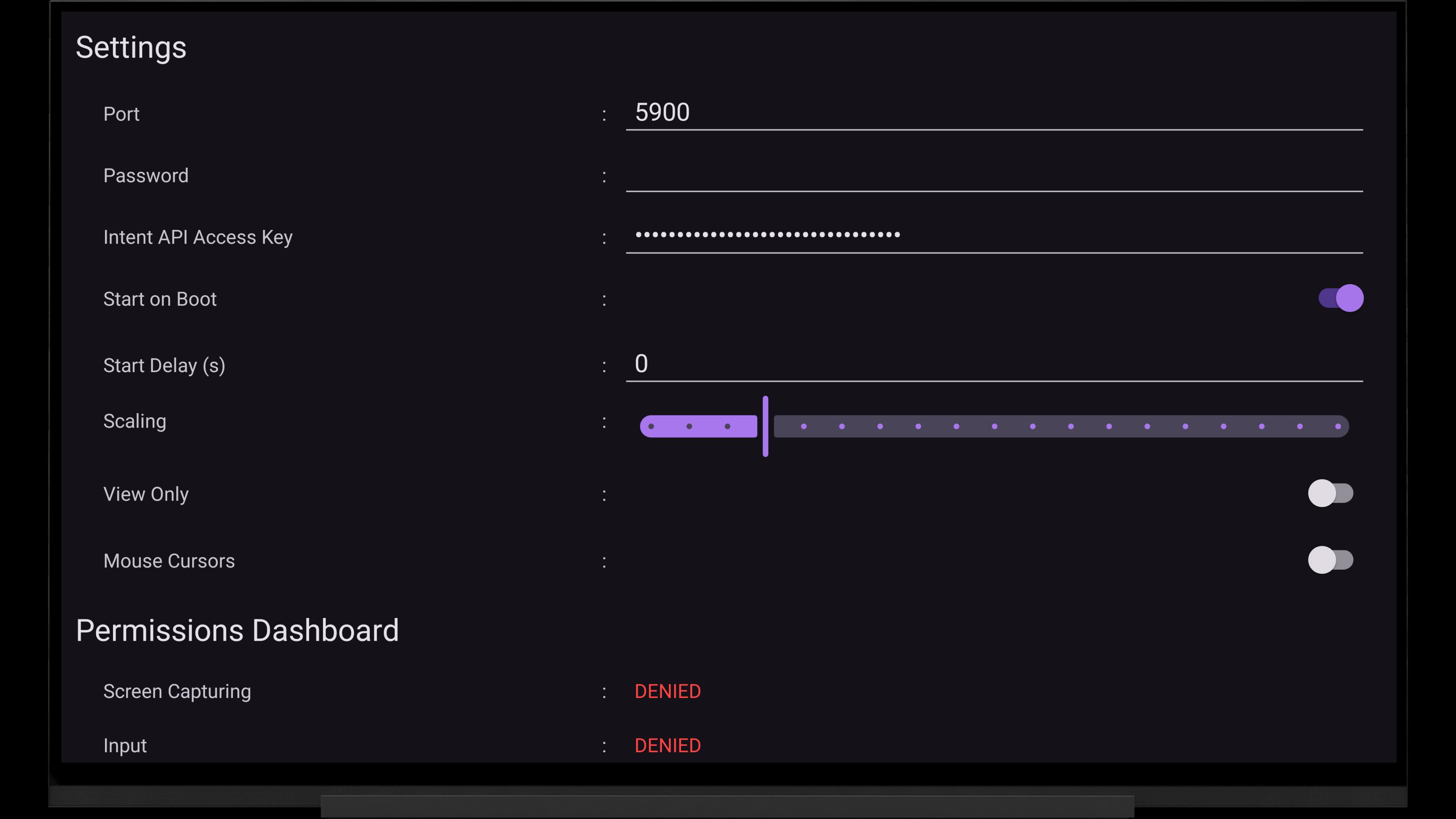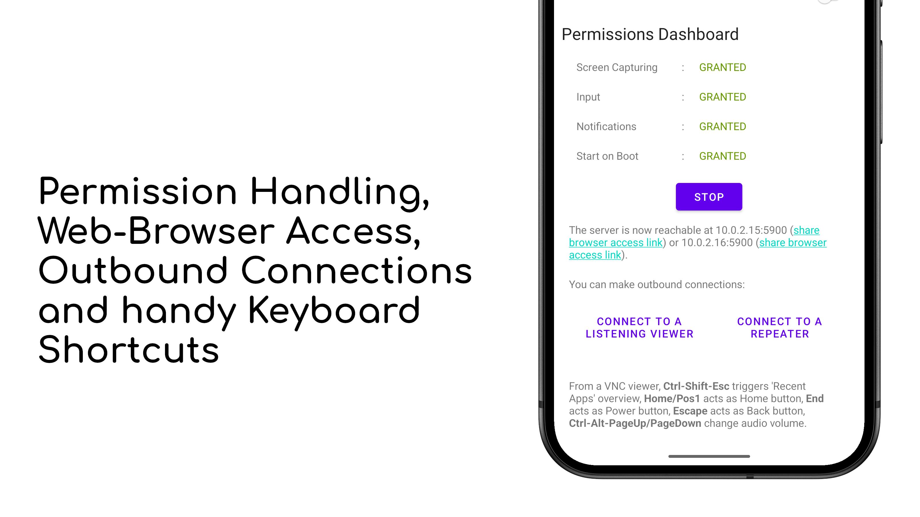- रिमोट कंट्रोल: माउस और बेसिक कीबोर्ड इनपुट सहित अपने डिवाइस को नियंत्रित करने के लिए अपने VNC क्लाइंट का उपयोग करें। इसे सक्षम करने के लिए, आपको अपने डिवाइस पर एक्सेसिबिलिटी API सेवा को सक्रिय करना होगा।