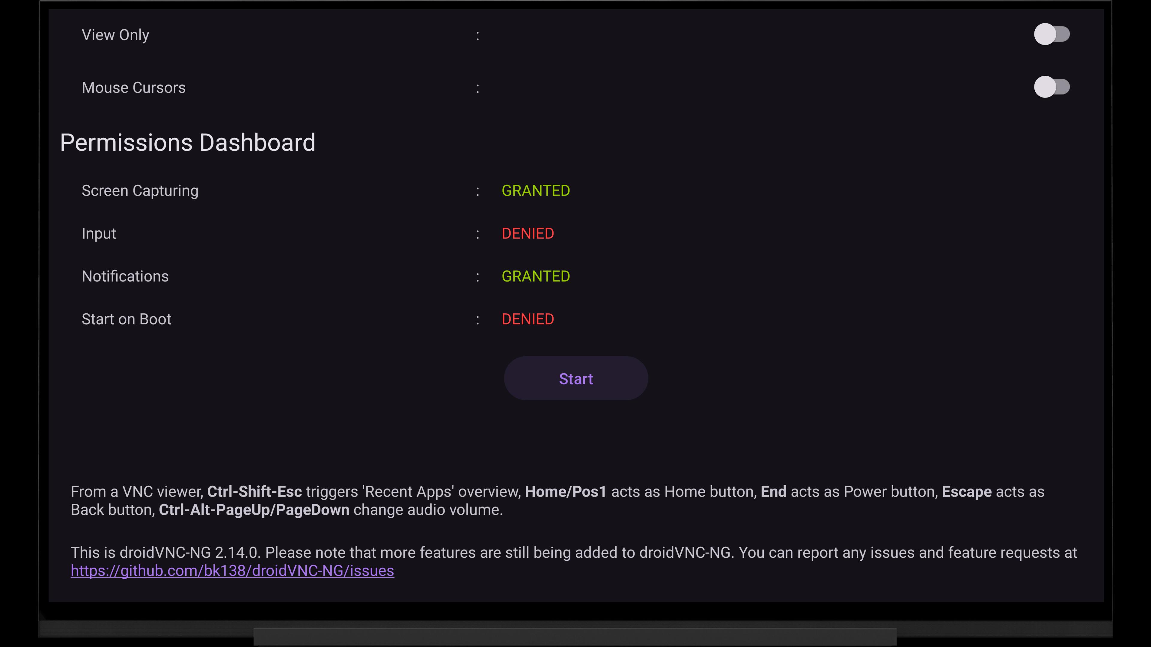 कृपया ध्यान दें कि droidVNC-NG में अभी भी और सुविधाएँ जोड़ी जा रही हैं। कृपया किसी भी समस्या और सुविधा अनुरोध की रिपोर्ट https://github.com/bk138/droidVNC-NG पर करें