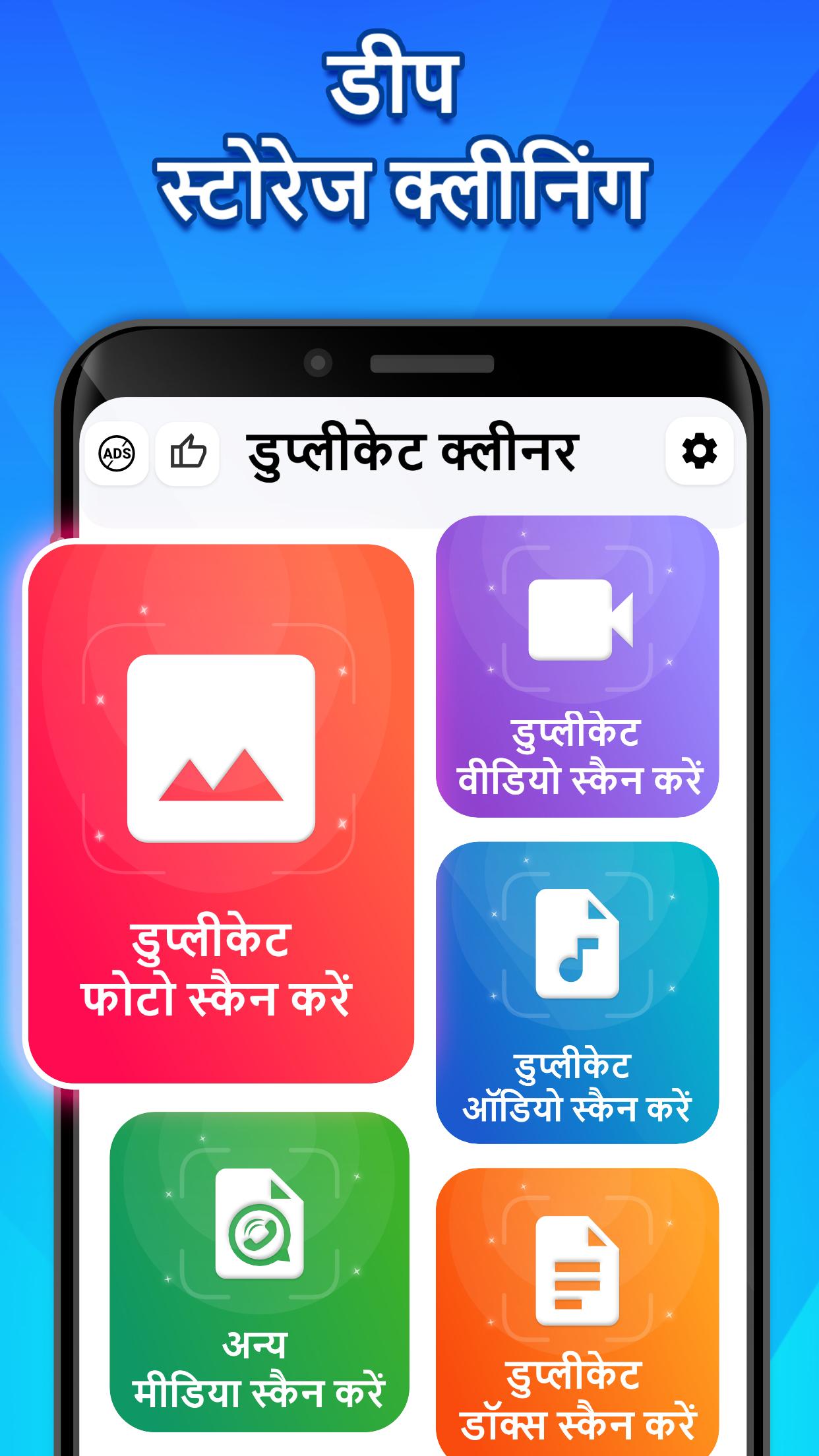 मल्टी-फॉर्मेट संगतता: जब आपको समान फ़ोटो, वीडियो, टेक्स्ट डॉक्यूमेंट या APK को डिलीट करने की आवश्यकता होती है, तो हमारा डुप्लिकेट क्लीनर कुशलतापूर्वक कई फ़ाइल प्रकारों को स्कैन करके हटा देता है।