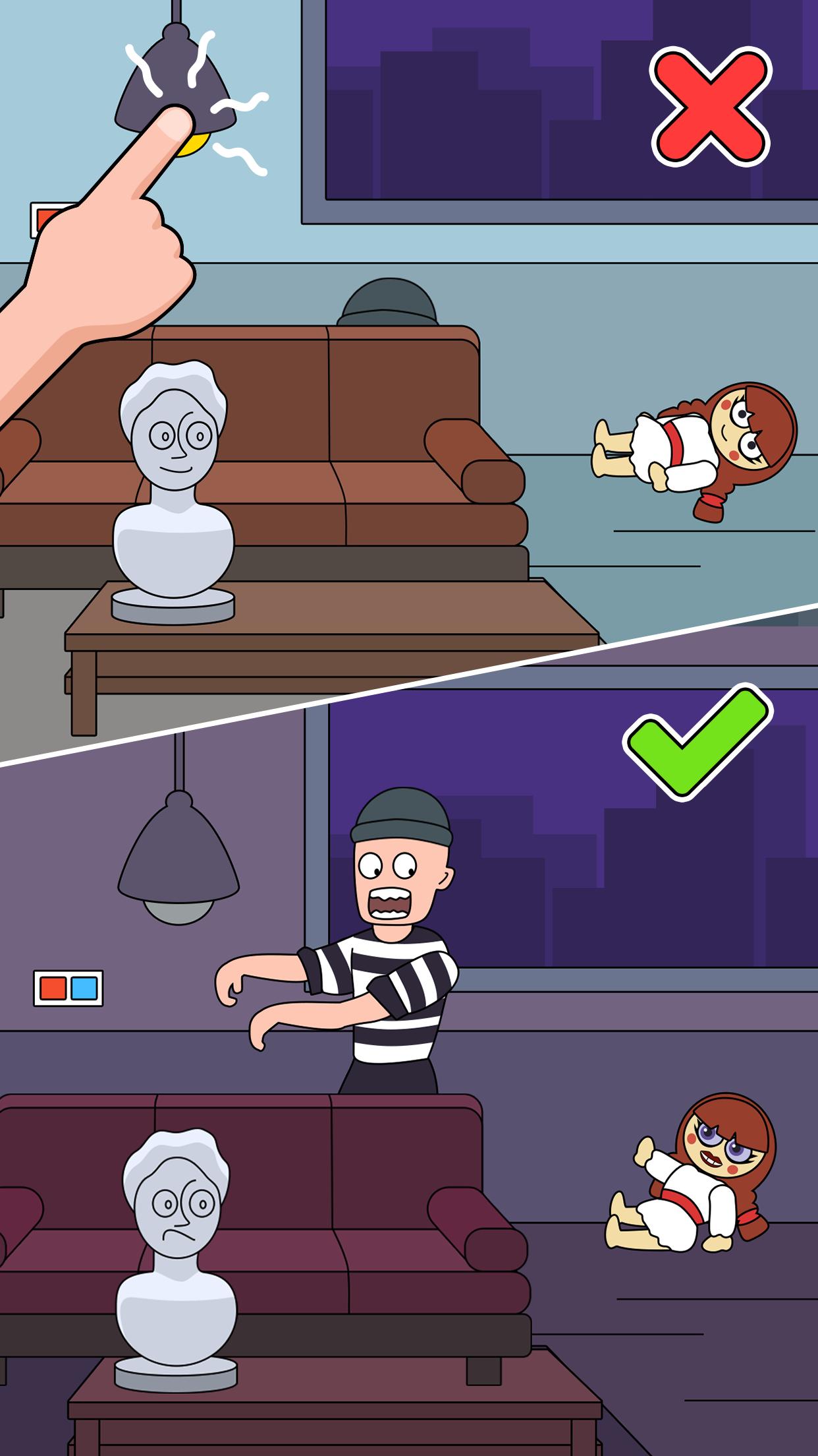 How to play?! For the mind puzzles and mind games you'll need to think outside of the box, and sometimes outside of your phone. You might have to shake or tilt your phone to solve! You'll need to think carefully about how to pass a level. Sometimes you need to combine objects to solve these funny IQ test questions! Use that logic and your detective brain to solve! Puns? Maybe...