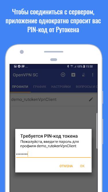 «OpenVPN SC» создает VPN-соединение используя сертификат и закрытый ключ с USB или Bluetooth токена семейства “Рутокен ЭЦП” для допуска в виртуальную сеть построенную на OpenVPN. Теперь для доступа к виртуальной сети нужны две вещи: иметь Рутокен при себе и знать от него PIN-код.