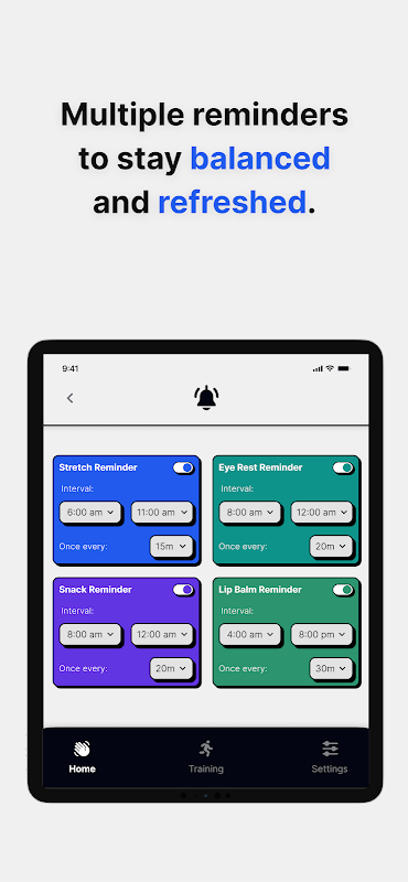 अपने प्रवाह को बाधित किए बिना संतुलित और तरोताजा रहने के लिए स्ट्रेच, स्नैक या आई रेस्ट टाइमर सेट करें।