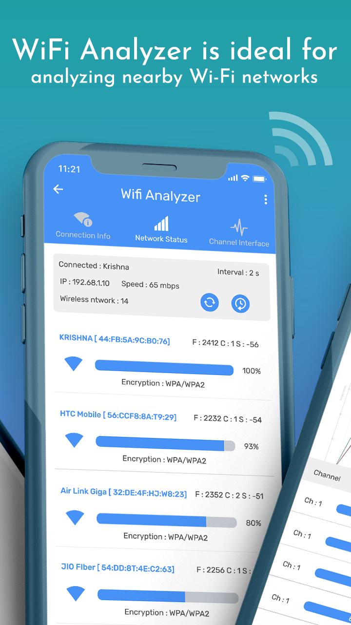 WiFi Signal Strength app is constantly updating the signal strength so you can walk around your house, work, or anywhere to find the best WiFi signal. WiFi Analyzer Recommends the best channel and place for your network and gives you the most useful optimization information to help decrease interference and increase connection speed and stability.