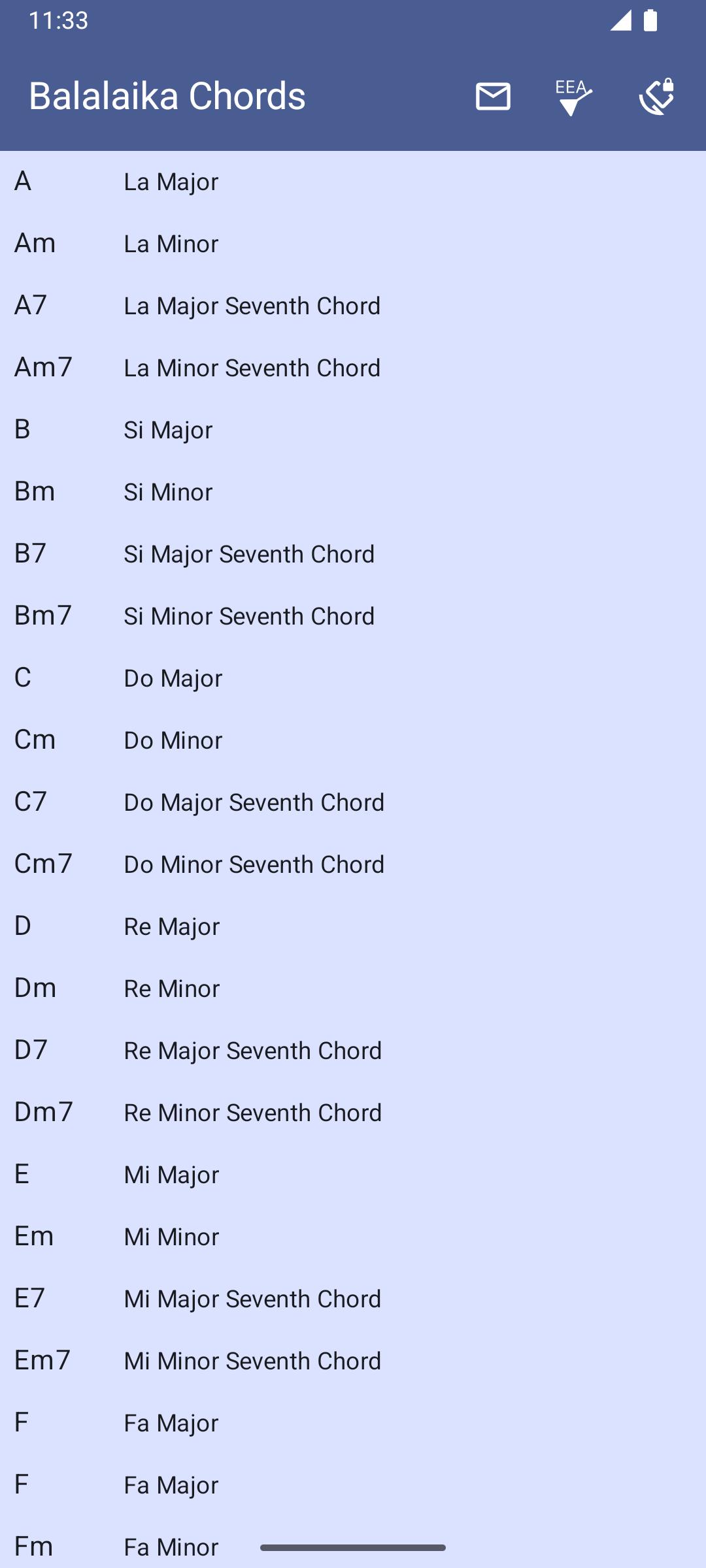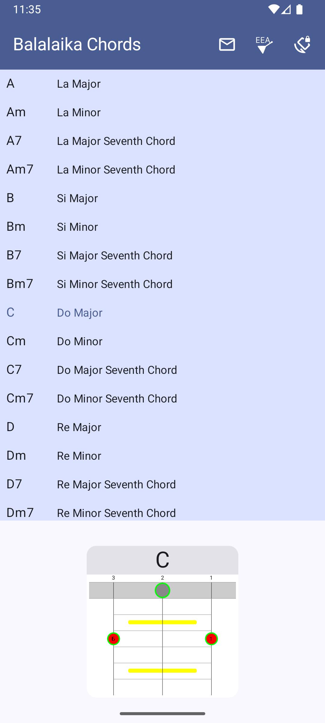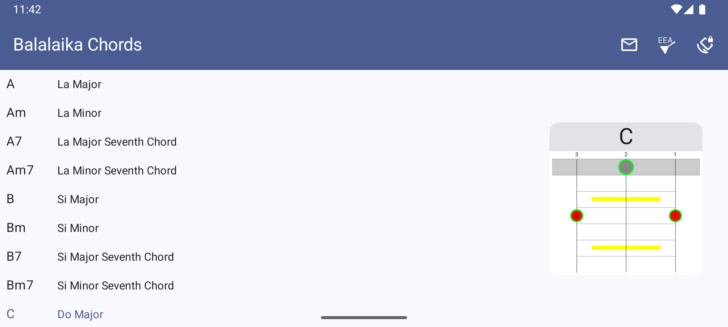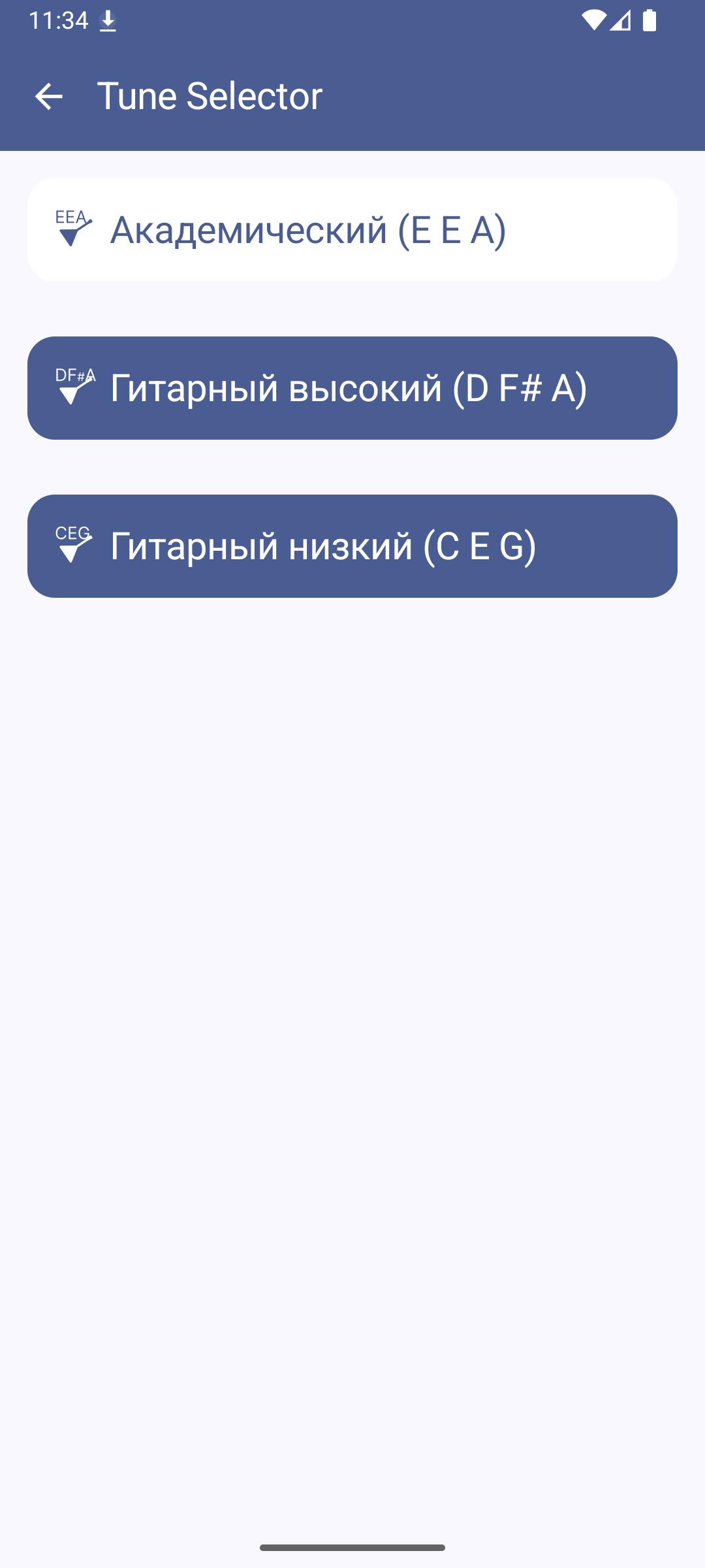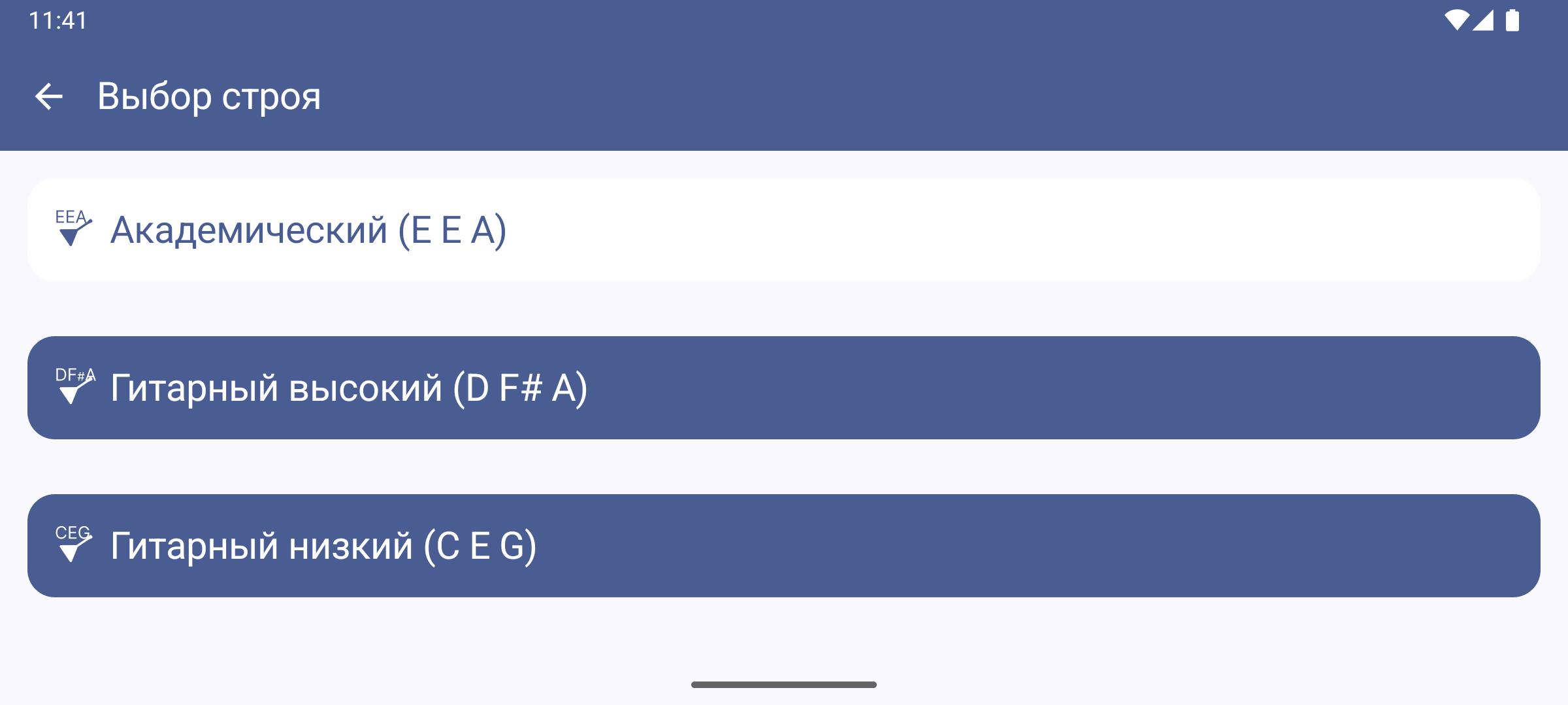 L'applicazione offre diverse accordature per balalaika (accademica, per chitarra, acuta e grave).