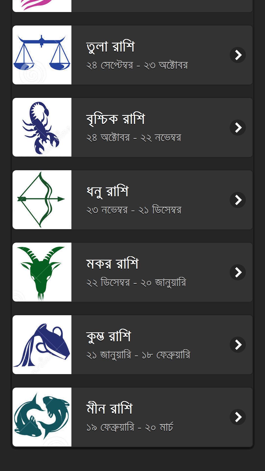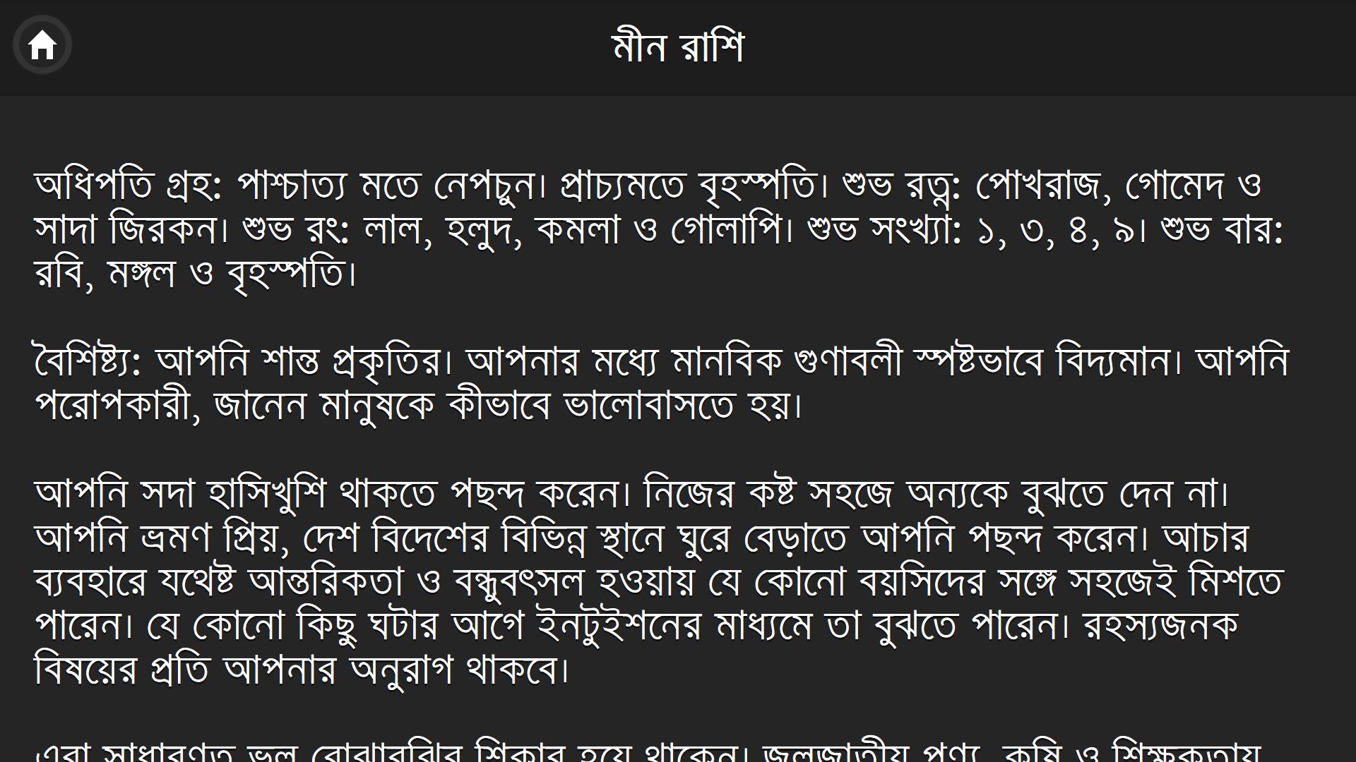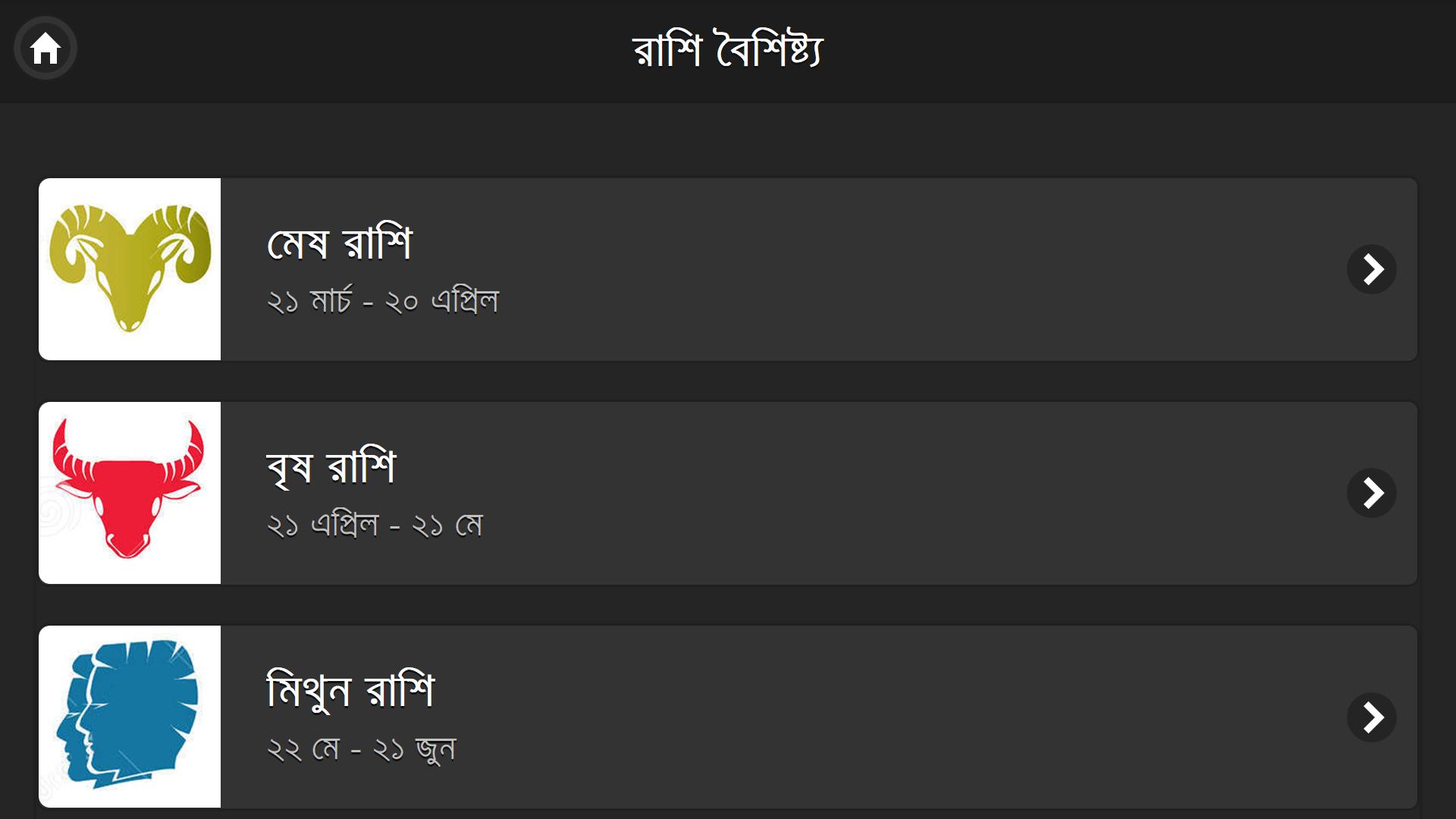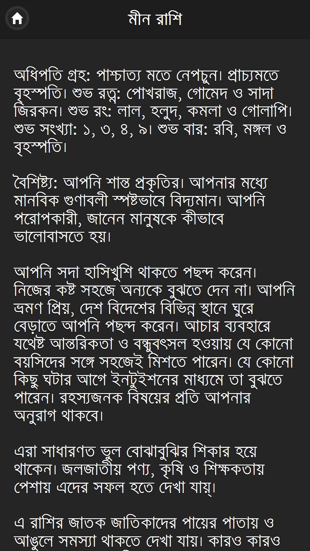 কোন রাশির মানুষ কেমন তা জানতে হলে এই অ্যাপটি ইন্সটল করতে হবে কেননা এই এপটিতে দেয়া আছে কোন রাশির মানুষ কেমন। দেয়া আছে রাশি ভেদে ভিন্ন ভিন্ন মানুশের ভিন্নতা। রয়েছে সব রাশির বৈশিষ্ট্য।