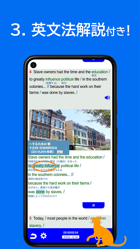 Include audio in inglese, traduzione in giapponese e spiegazione della grammatica inglese! Con il supporto come la traduzione Ruby per il vocabolario più difficile, anche chi non è bravo in inglese può divertirsi imparando.