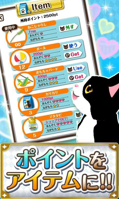 猫じゃらしやボール、またたびなど、アイテムの種類も豊富なので、いろんなアイテムをゲットして、猫たちとたわむれよう★