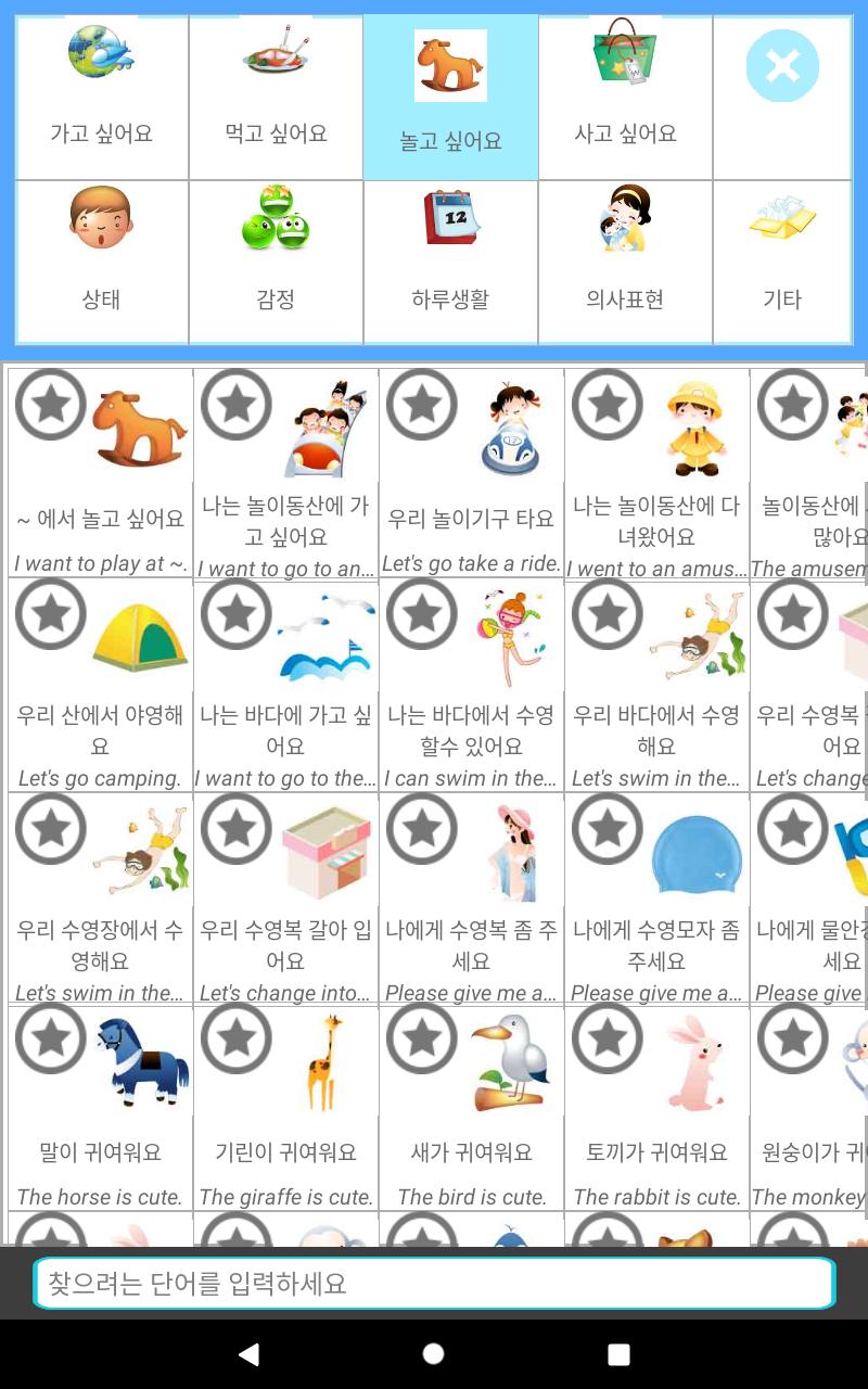 일상에서 자주 사용하는 단어를 카테고리별로 나누어 몇번의 아이콘 터치만으로 자연스럽게 회화를 익힐 수 있습니다.
