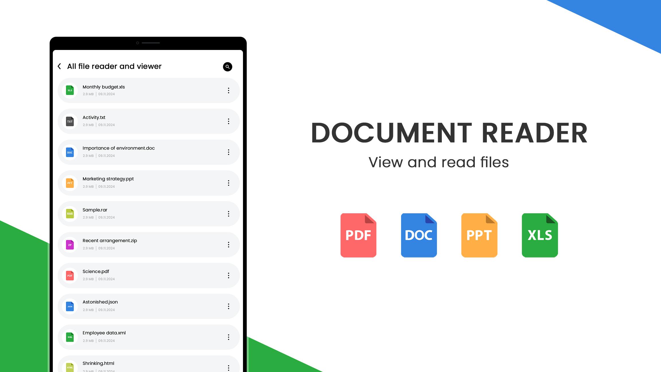 Prova questo lettore e visualizzatore di tutti i file per visualizzare e leggere documenti importanti, questo visualizzatore di file funziona con tutti i tipi di file Office come PDF, DOC, DOCX, XLS, XLSX, PPT e TXT. Esegue la scansione del telefono per i file e li ordina in cartelle, semplificando la ricerca e la visualizzazione di tutto in un unico posto. Lettore di file e visualizzatore di documenti Word progettato per supportare vari formati di file e offre una gestione efficiente dei documenti in questa app di lettura PPT. Il lettore di file HTML per Android aprirà i tuoi file HTML, se vuoi aprire i tuoi file di documenti importanti e non hai un laptop o un PC, scarica questa app di lettore di tutti i file e gestore di file doc per aprire tutti i file sul tuo telefono cellulare. Il visualizzatore di file CSV e il lettore Xlxs gestiscono tutti i tuoi documenti! Ora puoi avere un gestore di documenti per il tuo telefono che ti consente di leggere file di tutti i tipi. Il lettore di file di tutti i documenti e il visualizzatore di Office ti aiutano ad aprire e visualizzare qualsiasi documento con questo visualizzatore di documenti.