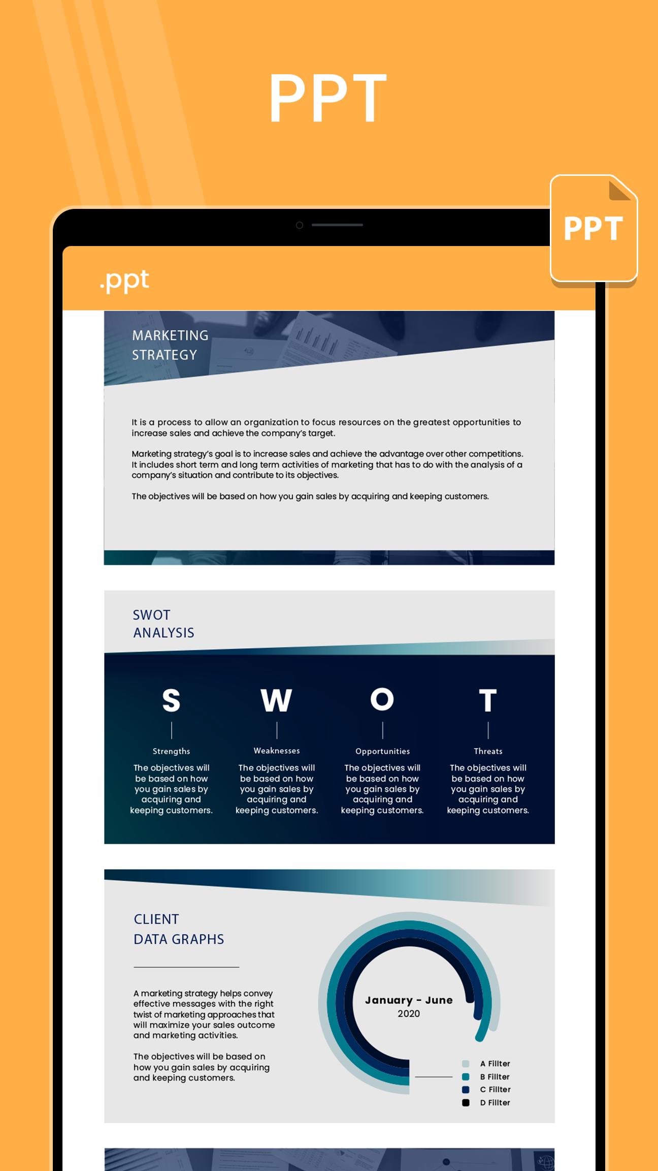 Lettore XLSX: Visualizzatore PPT è un modo rapido per aprire e visualizzare i documenti in un unico posto con l'aiuto del lettore di documenti Word. Se sei in viaggio e hai bisogno di aprire i tuoi documenti importanti, usa questo apri file e visualizzatore di file csv sul tuo dispositivo Android, questo renderà efficiente la tua vita. Lettore XML per Android: l'app di lettura file ODT fornisce un modo efficiente e rapido per visualizzare le diapositive o le presentazioni ppt direttamente dal tuo telefono Android. Accedi e leggi i tuoi documenti ppt e pptx senza problemi sul tuo dispositivo mobile, senza bisogno di un laptop, utilizzando questo lettore e visualizzatore di documenti all-in-one.