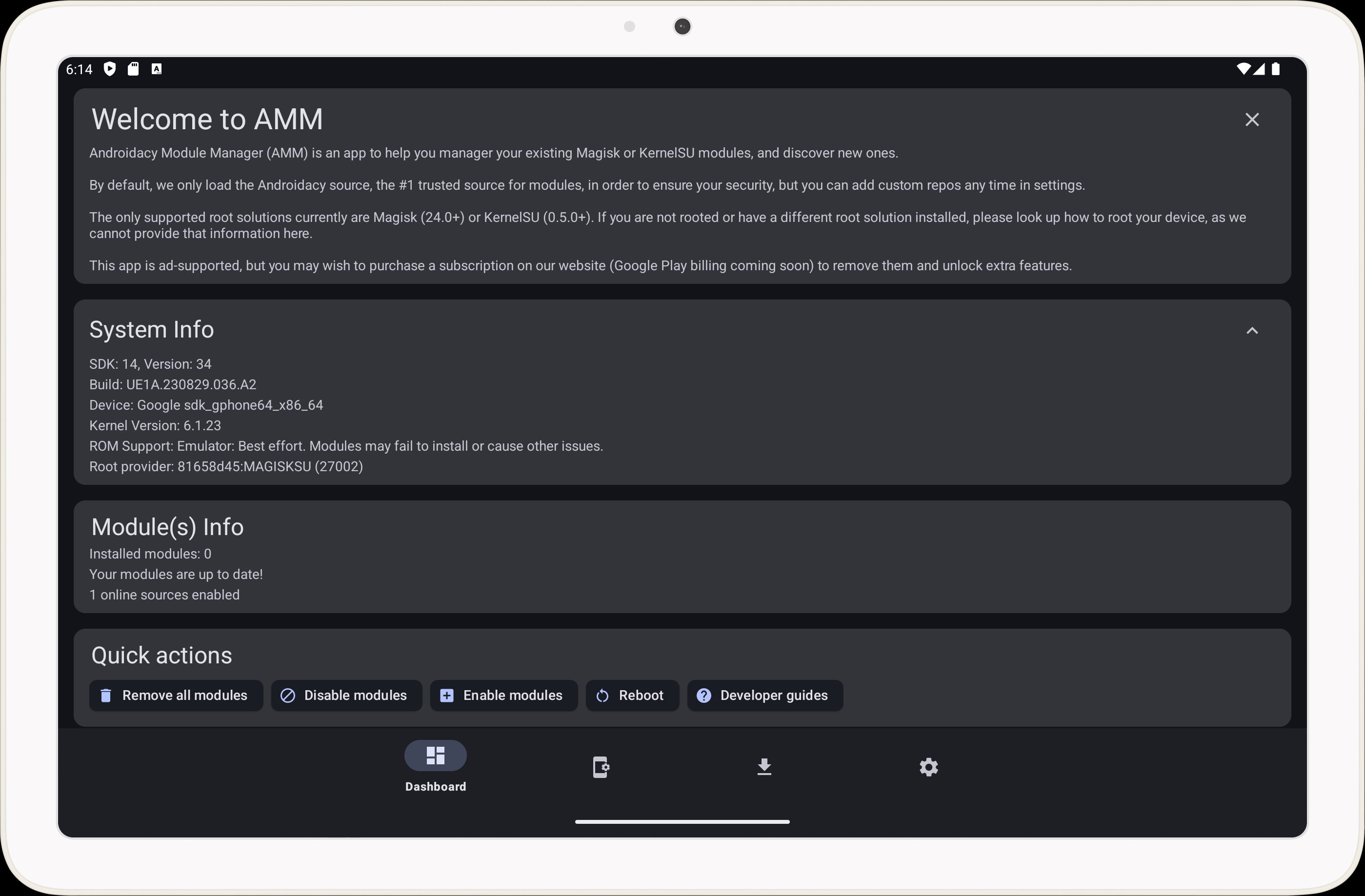 Prendi il controllo del tuo dispositivo come mai prima d'ora con Androidacy Module Manager, lo strumento definitivo per gestire, scoprire e installare moduli – ovvero plugin per framework root supportati che estendono le funzionalità e offrono caratteristiche aggiuntive. Che tu sia uno sviluppatore esperto, un appassionato di tecnologia o un utente comune, la nostra app è progettata per potenziare le capacità del tuo dispositivo.