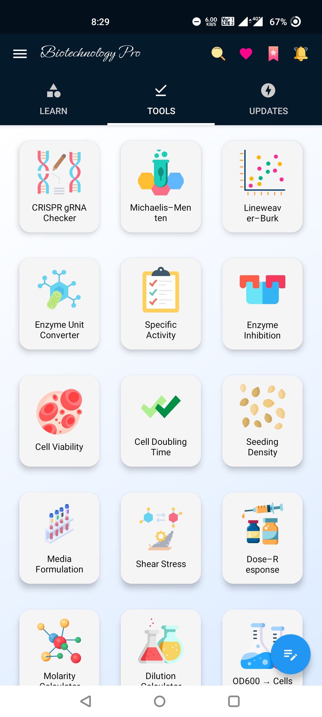 Oltre 30 strumenti avanzati di biotecnologia: analizzatori di DNA/RNA, calcolatori di cinetica enzimatica e PCR, simulatori di crescita microbica, stimatori di bioreattori, strumenti per il peso molecolare e altro ancora.