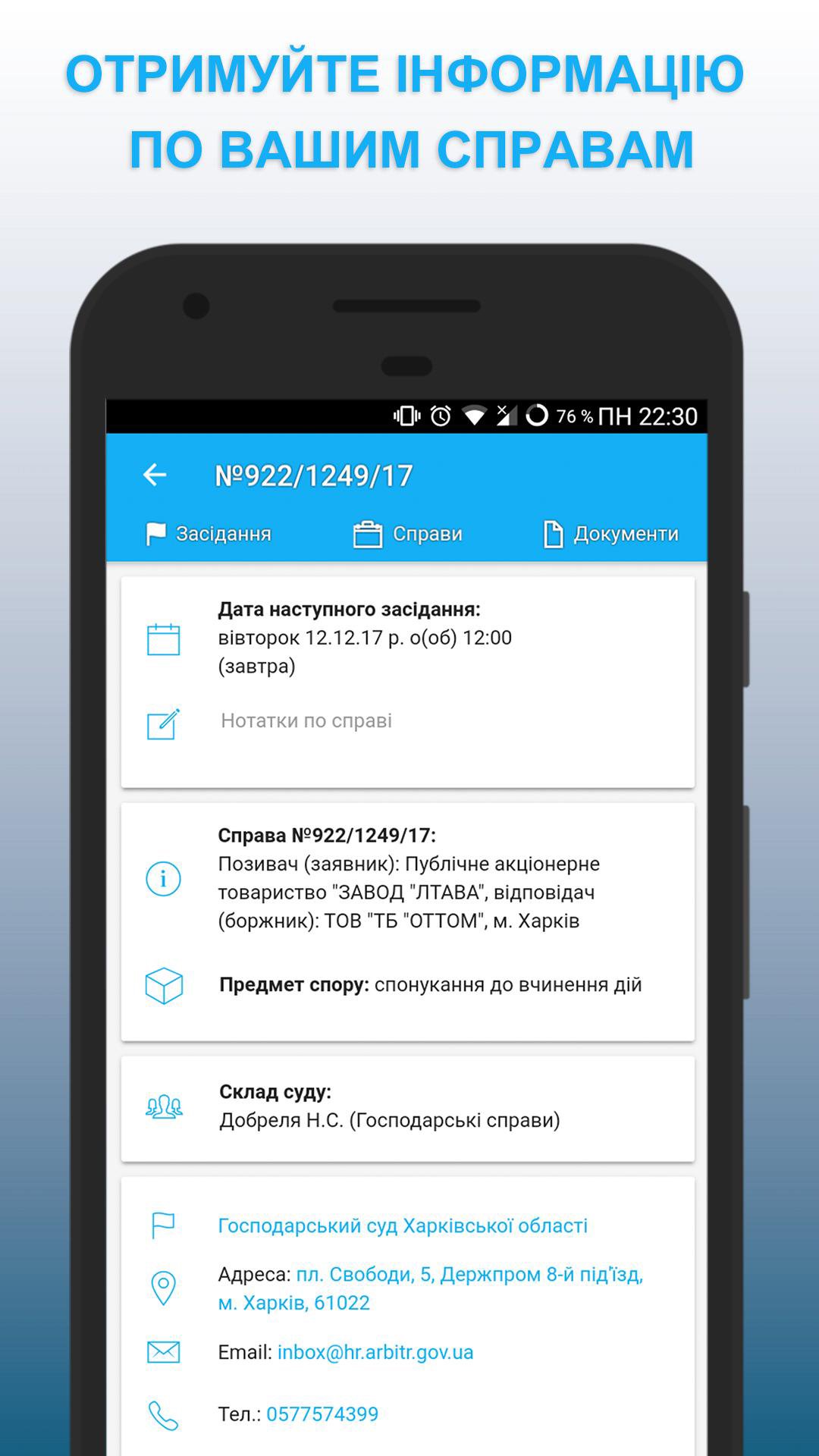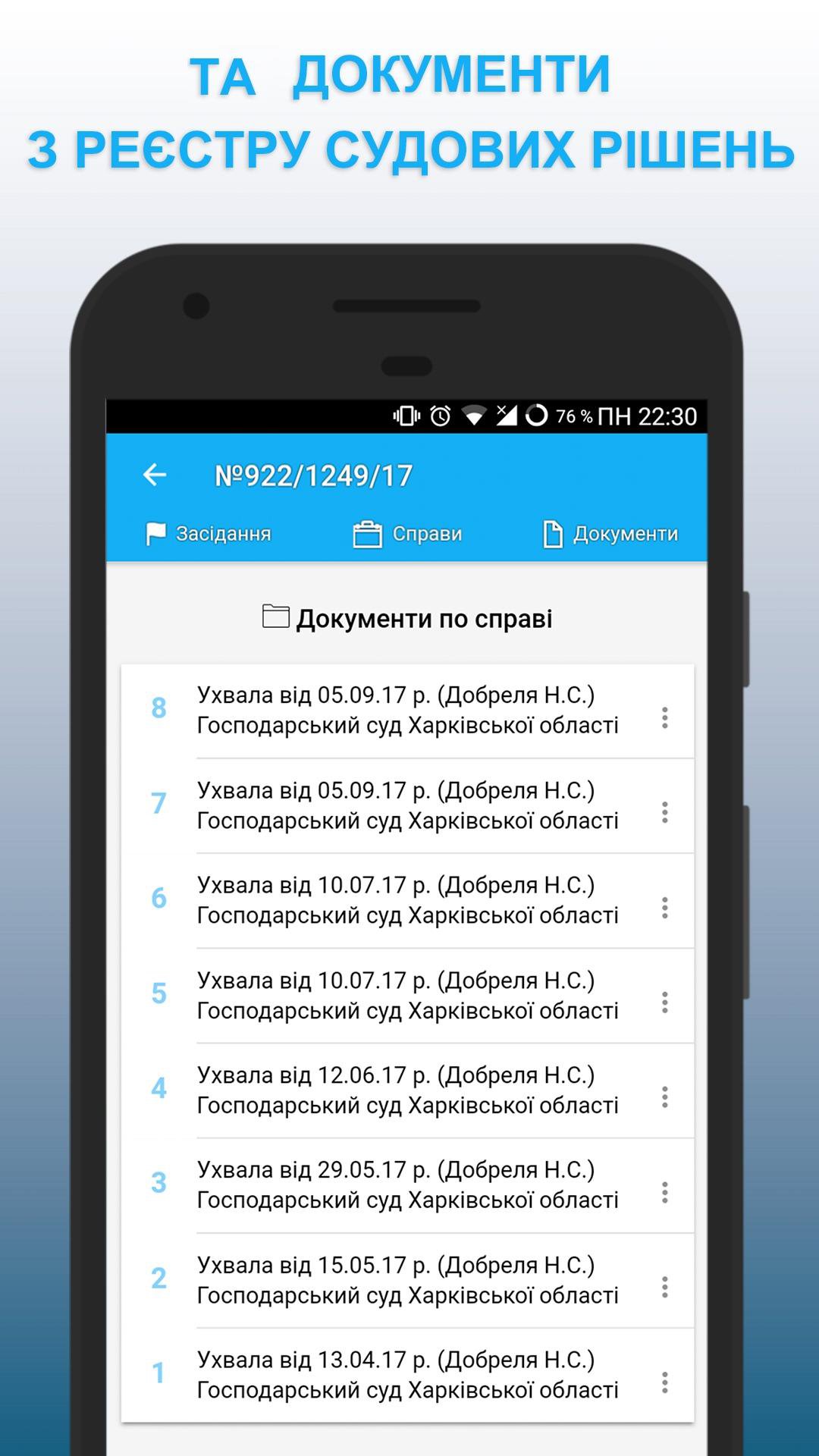 Scopri in modo rapido e conveniente le sessioni dei tribunali nei tribunali dell'Ucraina e ricevi gli atti giudiziari dal Registro delle decisioni dei tribunali. Aggiungi un caso per il follow-up e ottieni tutte le informazioni necessarie direttamente dal tuo dispositivo mobile, oppure trova e visualizza le decisioni dei tribunali dal registro statale unificato delle decisioni dei tribunali dell'Ucraina.
