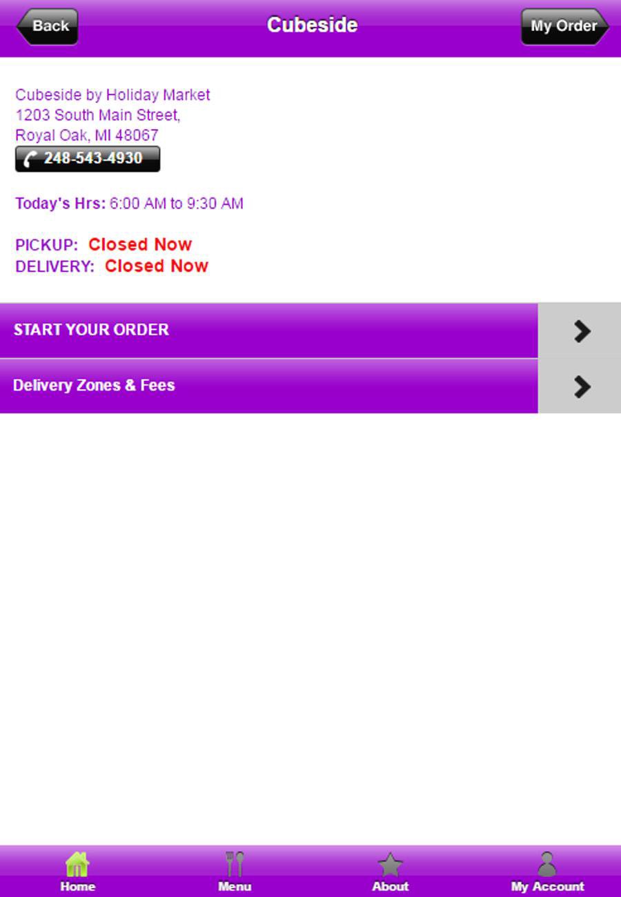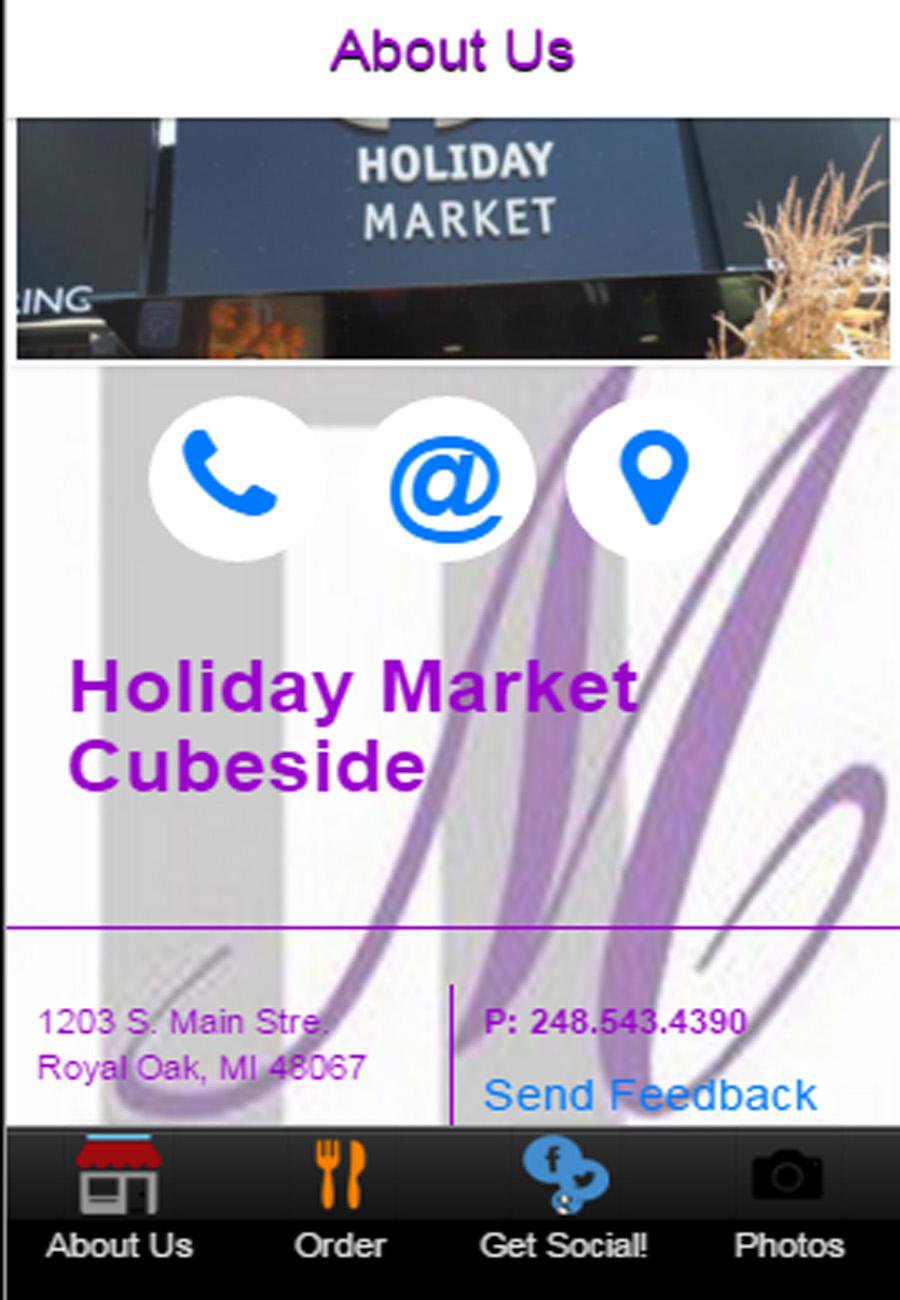 Get Cubeside by Holiday Market'ss amazing food now on the go! Download the [Restaurant] mobile app and access our online ordering anytime, anywhere. Order your favorite dishes for pick up or delivery. Also find us on your favorite social media site and connect with us for coupons and exclusive promotions.Last updated on Sep 15, 2016