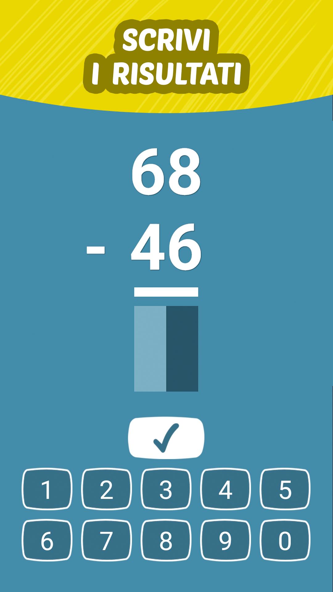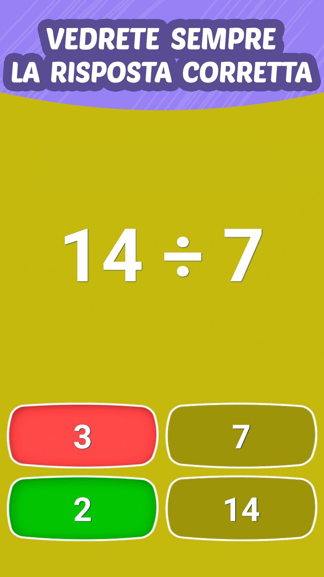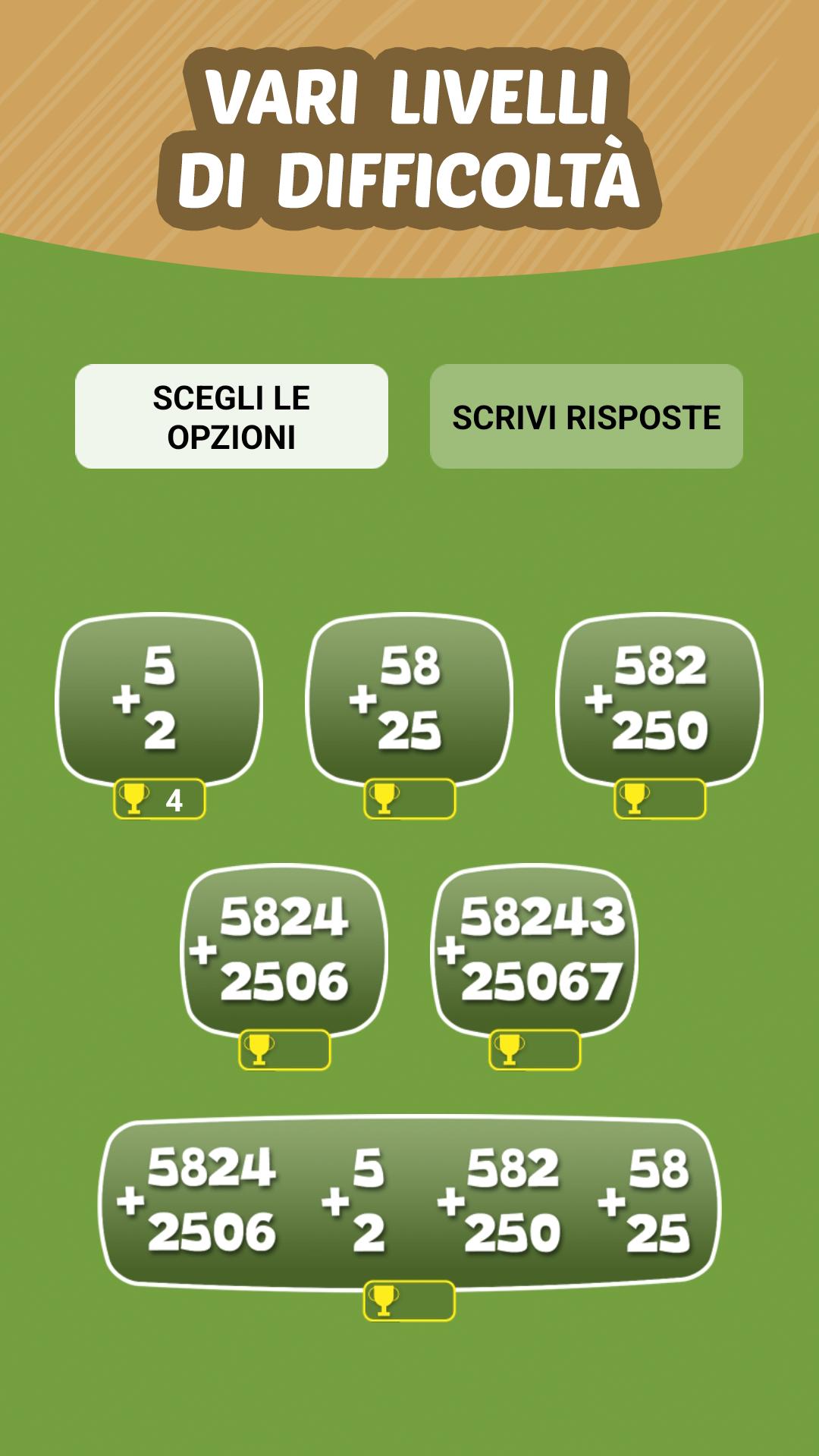 Puoi scegliere problemi matematici di vari livelli di difficoltà e mettere alla prova la tua aritmetica mentale scegliendo le risposte o scrivendo i risultati. Ci sono molti giochi di matematica tra cui scegliere: addizioni e sottrazioni, moltiplicazioni e divisioni, radici quadrate, percentuali, decimali e modalità mista con tutto insieme. È molto più facile imparare la matematica giocando.