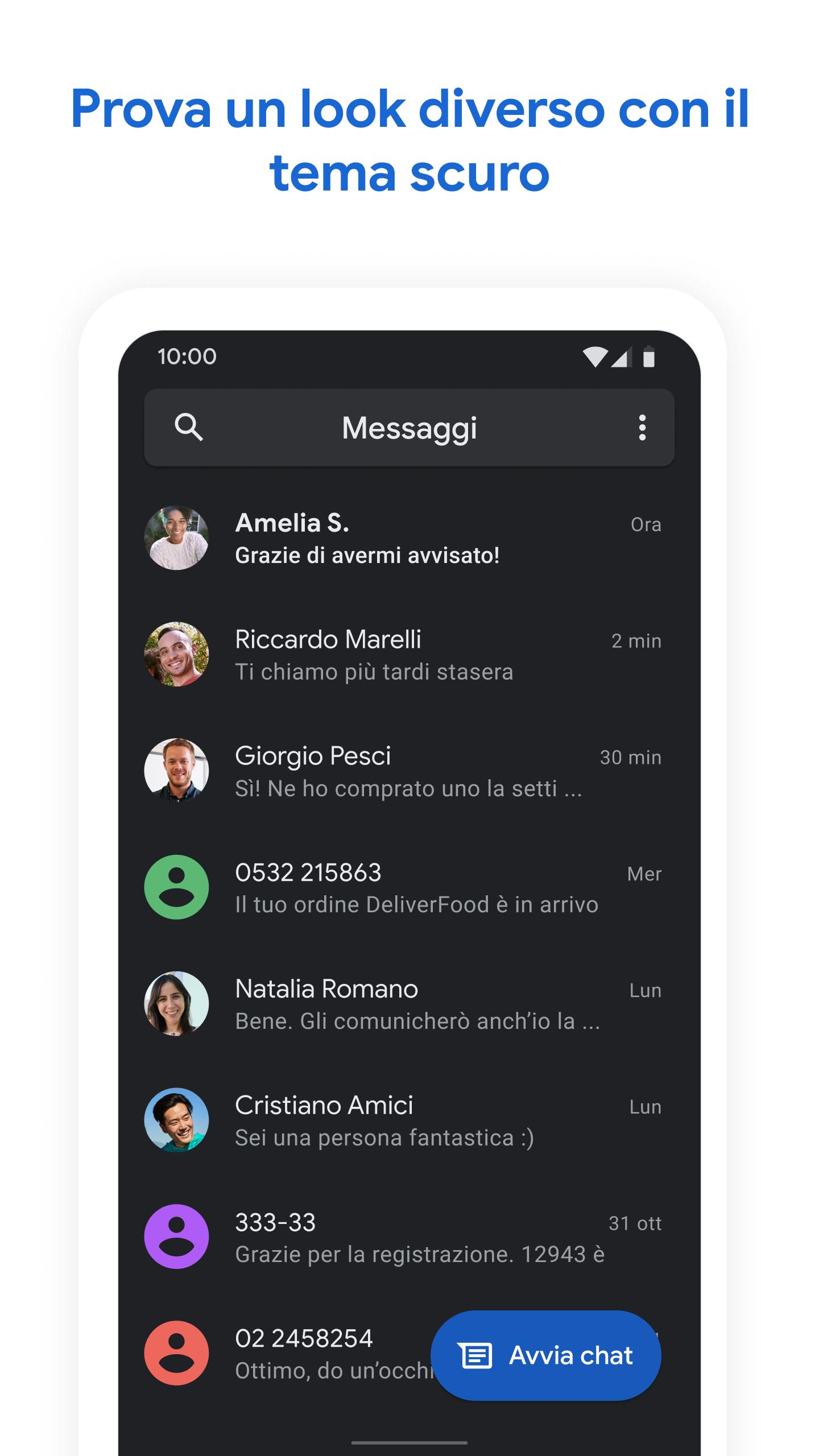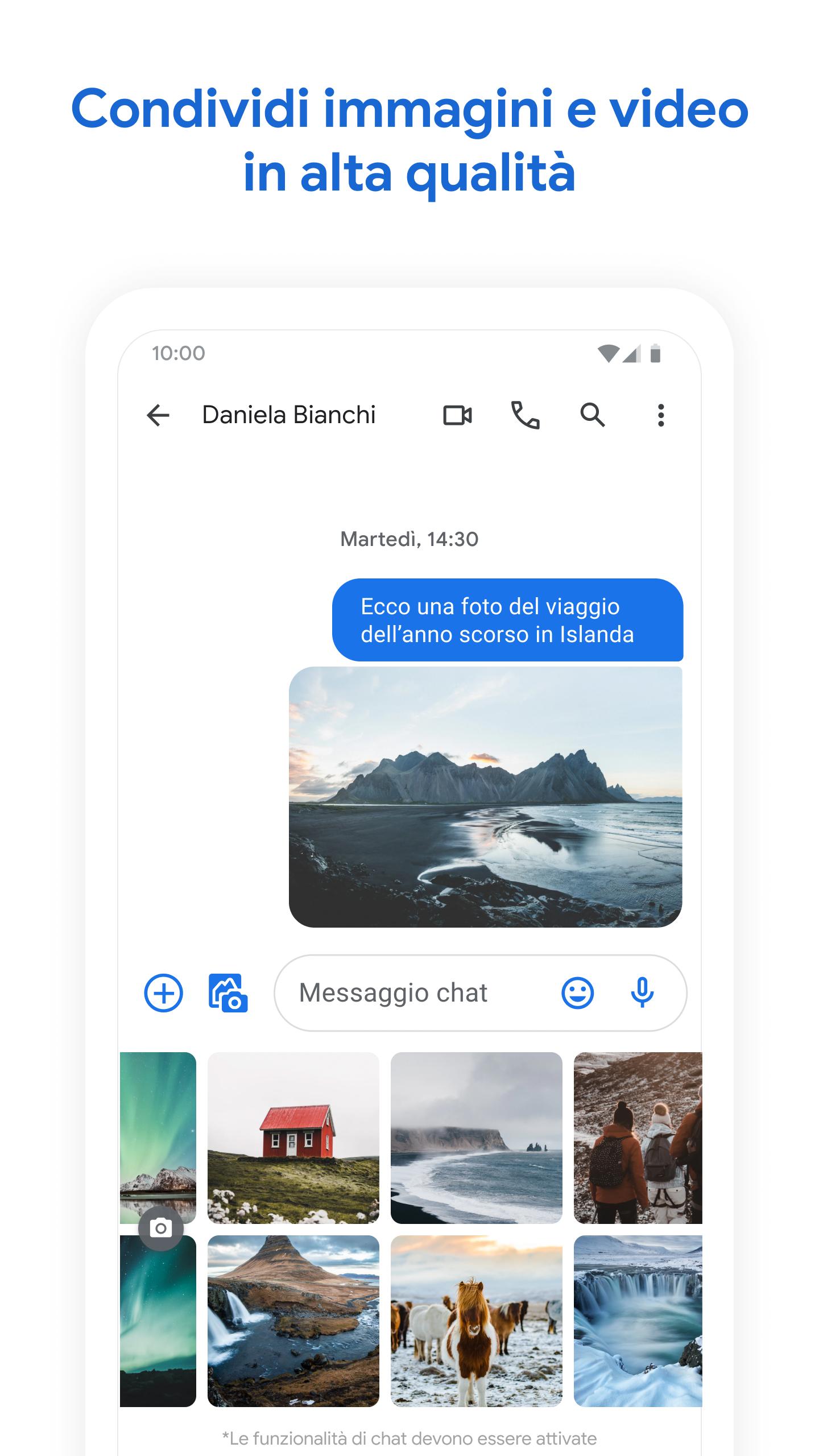 Google Messaggi è l'app Google ufficiale per la messaggistica. Google Messaggi sta rivoluzionando il modo in cui un miliardo di utenti comunica ed è basato su Rich Communication Services (RCS), lo standard di settore per l'invio di messaggi che sostituisce SMS e MMS. Con RCS puoi condividere foto e video ad alta risoluzione, partecipare a chat di gruppo dinamiche e comunicare senza problemi con altri utenti RCS, compresi i contatti con un iPhone.