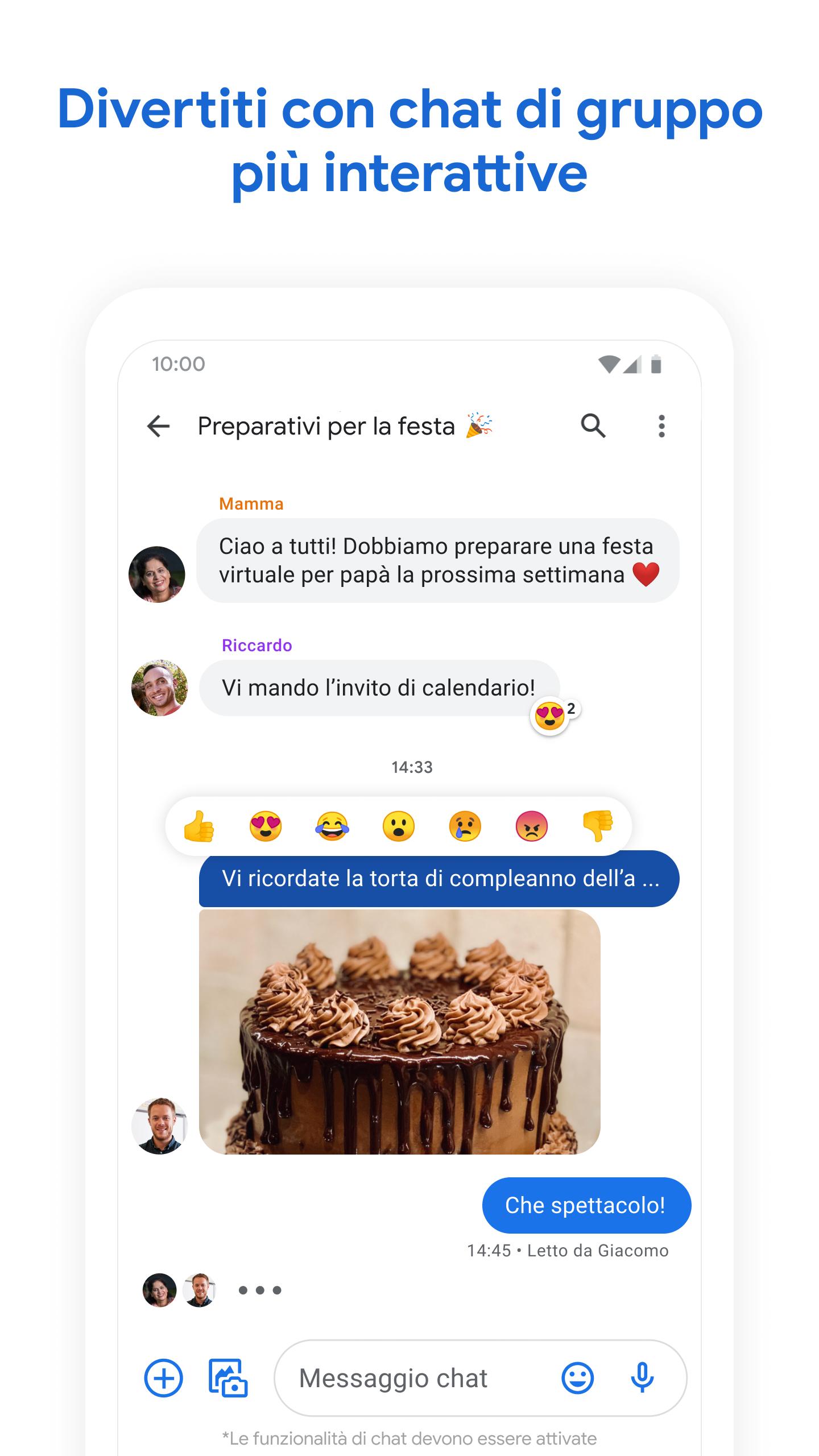 • Un tocco personale: rendi le conversazioni uniche con funzionalità come i colori personalizzati dei fumetti delle chat o le selfie GIF.