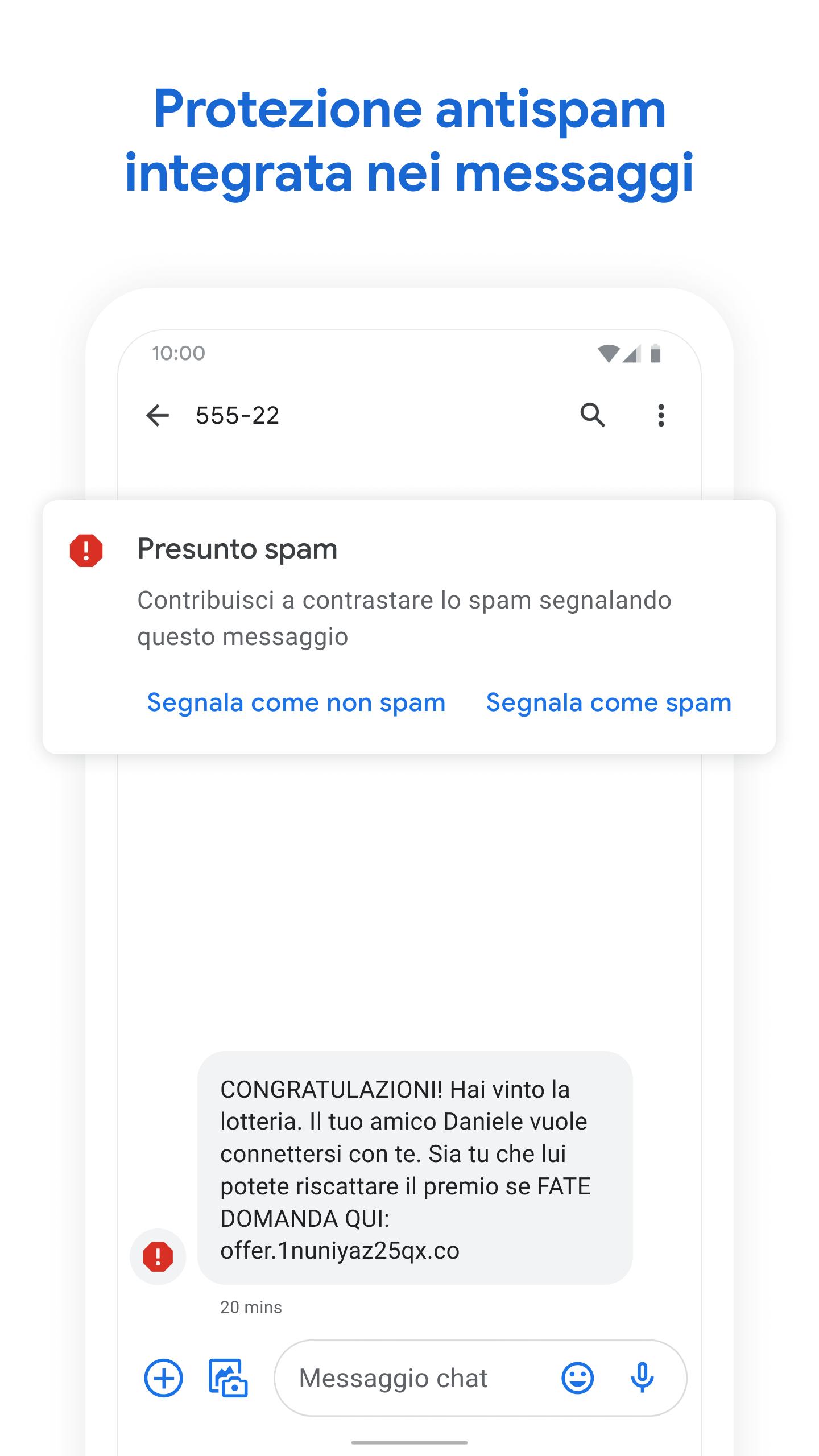 • La privacy è importante: le tue chat personali sono protette dalla crittografia end-to-end tra gli utenti di Google Messaggi, in modo che nessuno (compresi Google e terzi) possa leggere o visualizzare i tuoi messaggi e allegati, tranne la persona a cui stai scrivendo. Inoltre, avrai una protezione avanzata dallo spam.