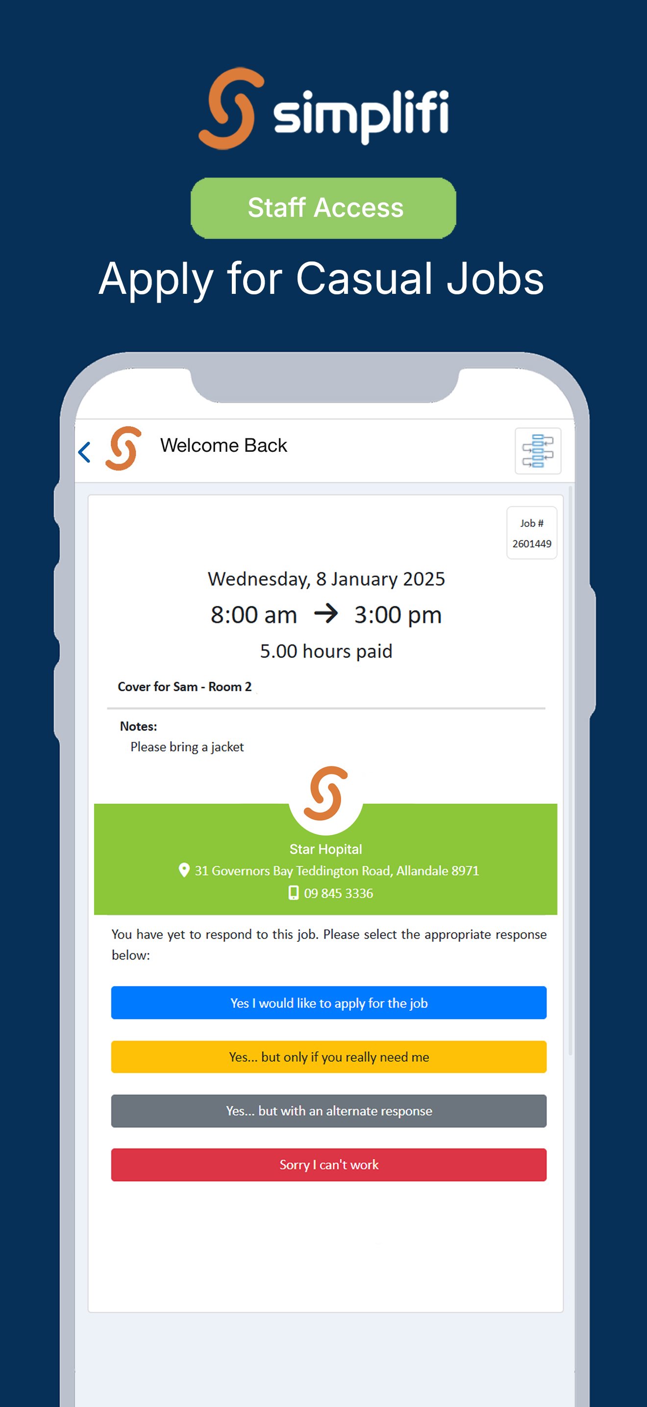 Attraverso Simplifi i datori di lavoro possono effettuare controlli delle presenze in tempo reale, modificare rapidamente gli elenchi, comunicare direttamente con il personale, pubblicare e coprire lavori occasionali e altro ancora, sia alla scrivania che in movimento.