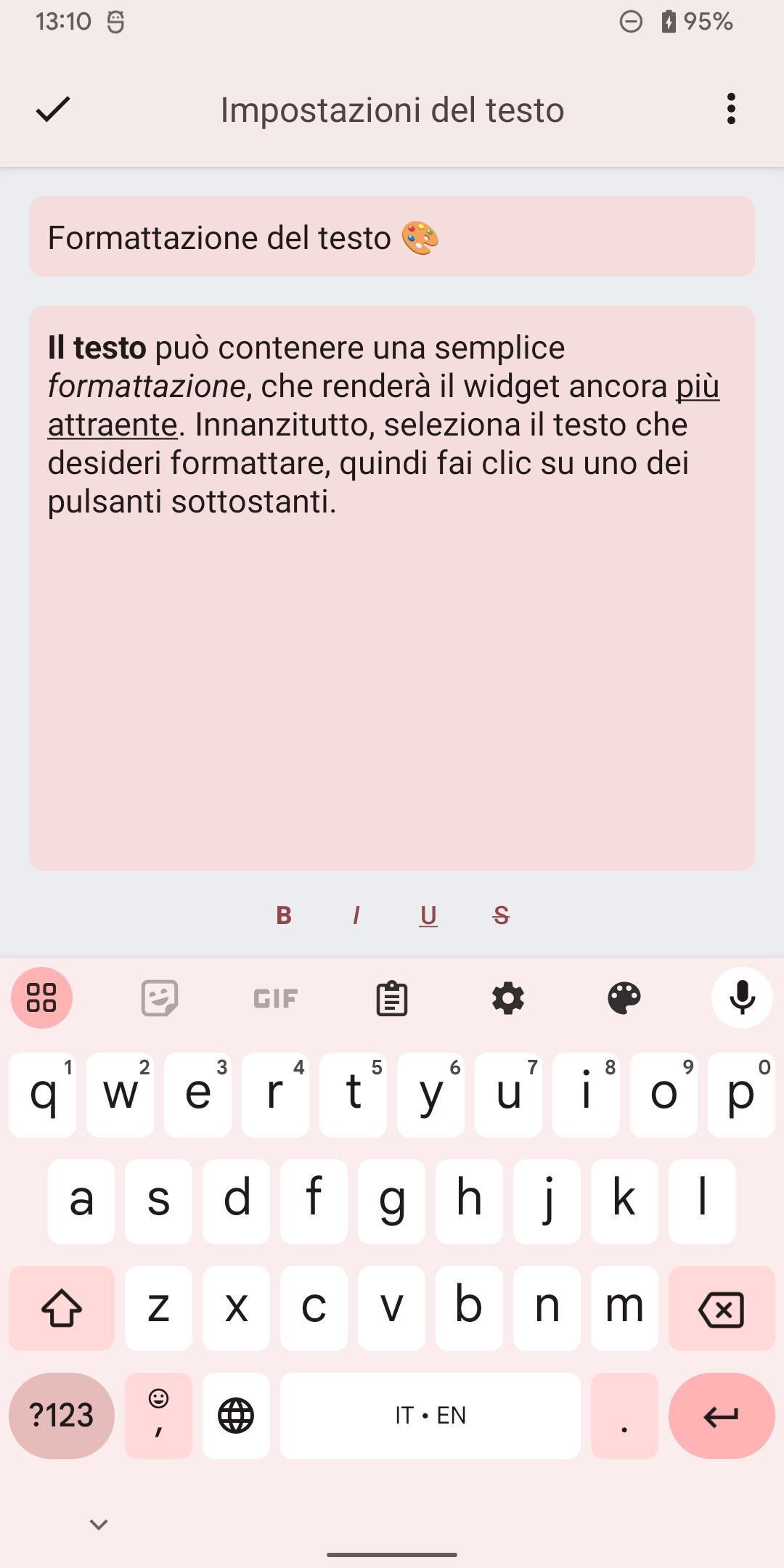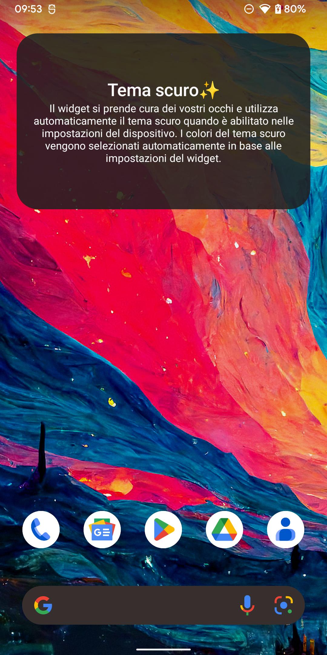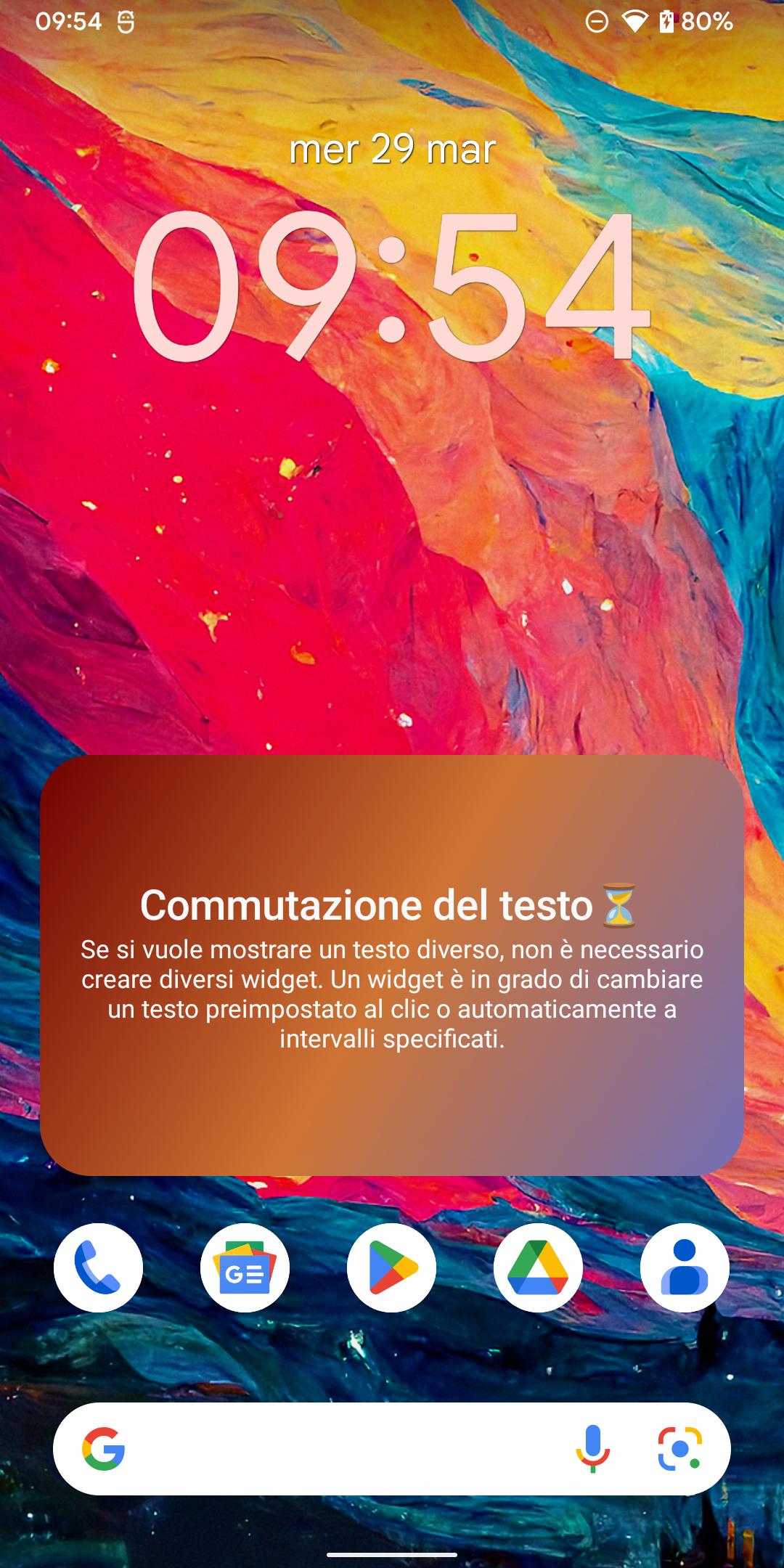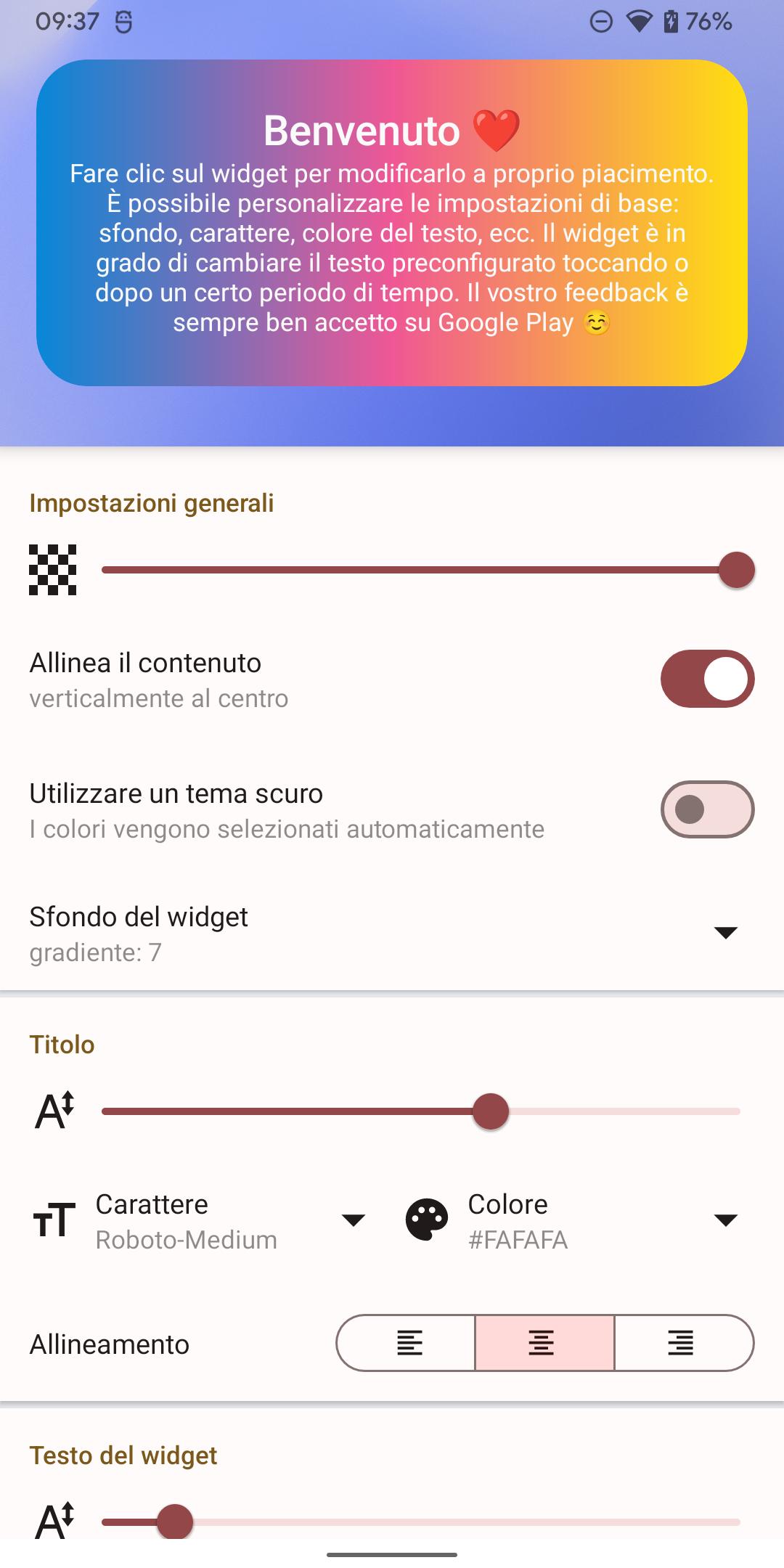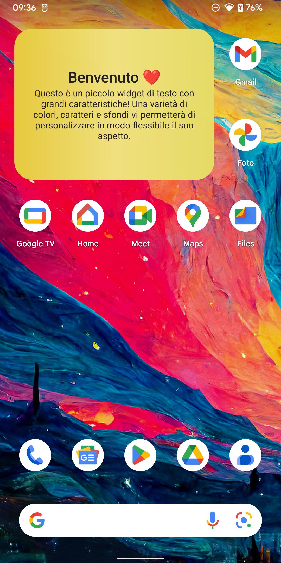 Un widget di testo è la soluzione migliore per le note. Volete ricordarvi qualcosa ogni volta che prendete il telefono? Aggiungete questo testo di promemoria al vostro desktop e non lo dimenticherete mai. È possibile creare un numero qualsiasi di note adesive con un design unico sulla schermata iniziale del dispositivo. Il widget di testo è flessibile: è supportato un gran numero di sfondi e font, e un tema scuro si prenderà cura dei vostri occhi. Inoltre, è possibile personalizzare la dimensione e il colore del testo della nota, nonché il suo allineamento. Se avete bisogno di mostrare un testo diverso, potete creare una nota adesiva che cambierà il testo al tocco o a intervalli. Questa funzione è utile per chi impara nuove parole straniere o vuole visualizzare citazioni motivazionali sulla schermata iniziale.Last updated on Jul 19, 2025