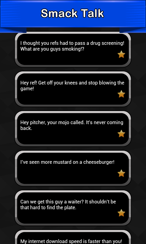 Need help Trash Talking? Trash Talk app is a collection of the best funny trash talk lines for all all sports including fantasy football trash talk, basketball, baseball, and hockey. Hecklers, do you need help heckling fans, players and referees? Learn the fine art of talking trash, smack talk and comebacks! If you are looking for good trash talk quotes to improve your trash talking game, download this free app.Last updated on Feb 16, 2016