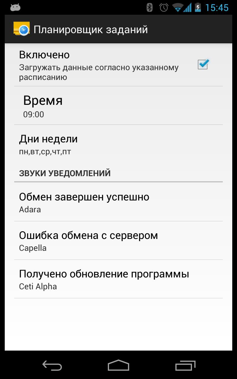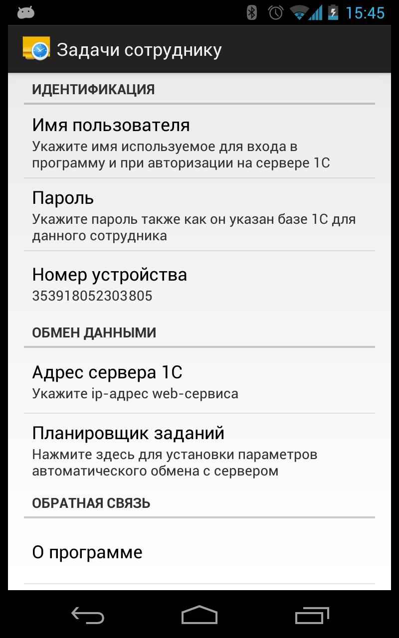 Чтобы проверить обмен с сервером, необходимо предварительно зарегистрировать ваше Android-устройство в демо-базе 1С, где вы самостоятельно устанавливаете параметры авторизации (имя пользователя и пароль) и идентификатор устройства. Как это сделать описано в статье «Демонстрационное приложение 'Задачи сотруднику'» на сайте http://profi1c.ru