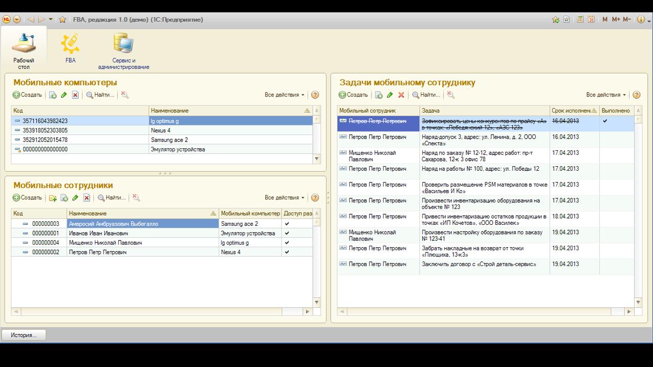 Задачи для мобильного сотрудника. Демонстрация работы клиент-серверного приложения для «1С:Предприятие 8» созданного с использованием “FBA Toolkit”. Данный фреймворк существенно облегчает процесс разработки корпоративного мобильного приложения на 1С + Android.