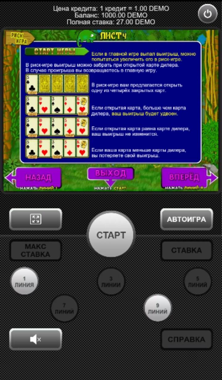 Основная игра состоит из классических линий, и при выпадении одинаковых символов ставка выигрывает. Здесь возможны различные комбинации символов, а ценность каждого из наборов можно посмотреть в специальной таблице, нажав кнопку информации. В качестве дикого символа, позволяющего сделать комбинацию выигрышной, выступает изображение маски. Есть в слоте и риск игра с угадыванием карт, которая удваивает выигрыш.