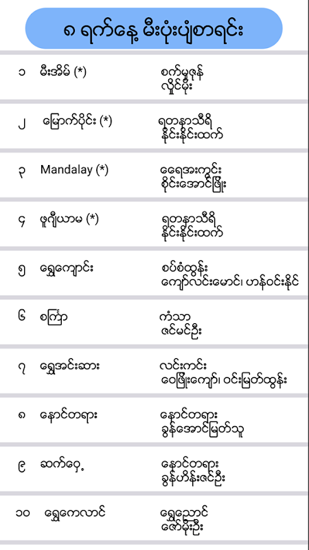 **** မီးပံုးပ်ံနာမည္ေဘးတြင္ (*) ပါရွိပါက စိန္နပန္ အမ်ိဳးအစားမီးပံုးပ်ံျဖစ္ပါသည္။