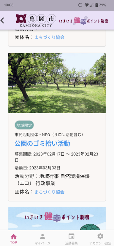 「亀岡市いきいき健幸ポイント制度」は、京都府亀岡市内のボランティア活動に参加して、ポイントを貯めることができるアプリです。