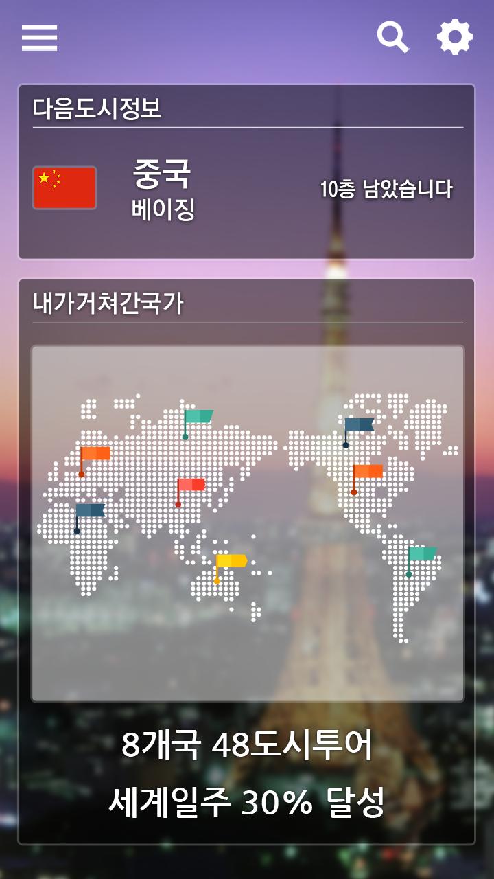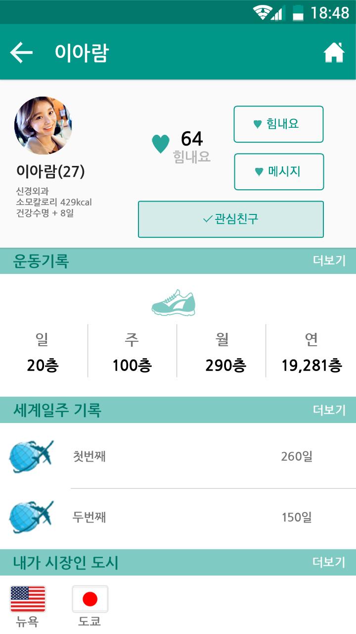 계단을 이용 또는 특정 지역을 이동함으로써 소모칼로리, 건강 수명등이 실시간 확인 되며, 이동량에 따라 세계일주를 할 수 있습니다