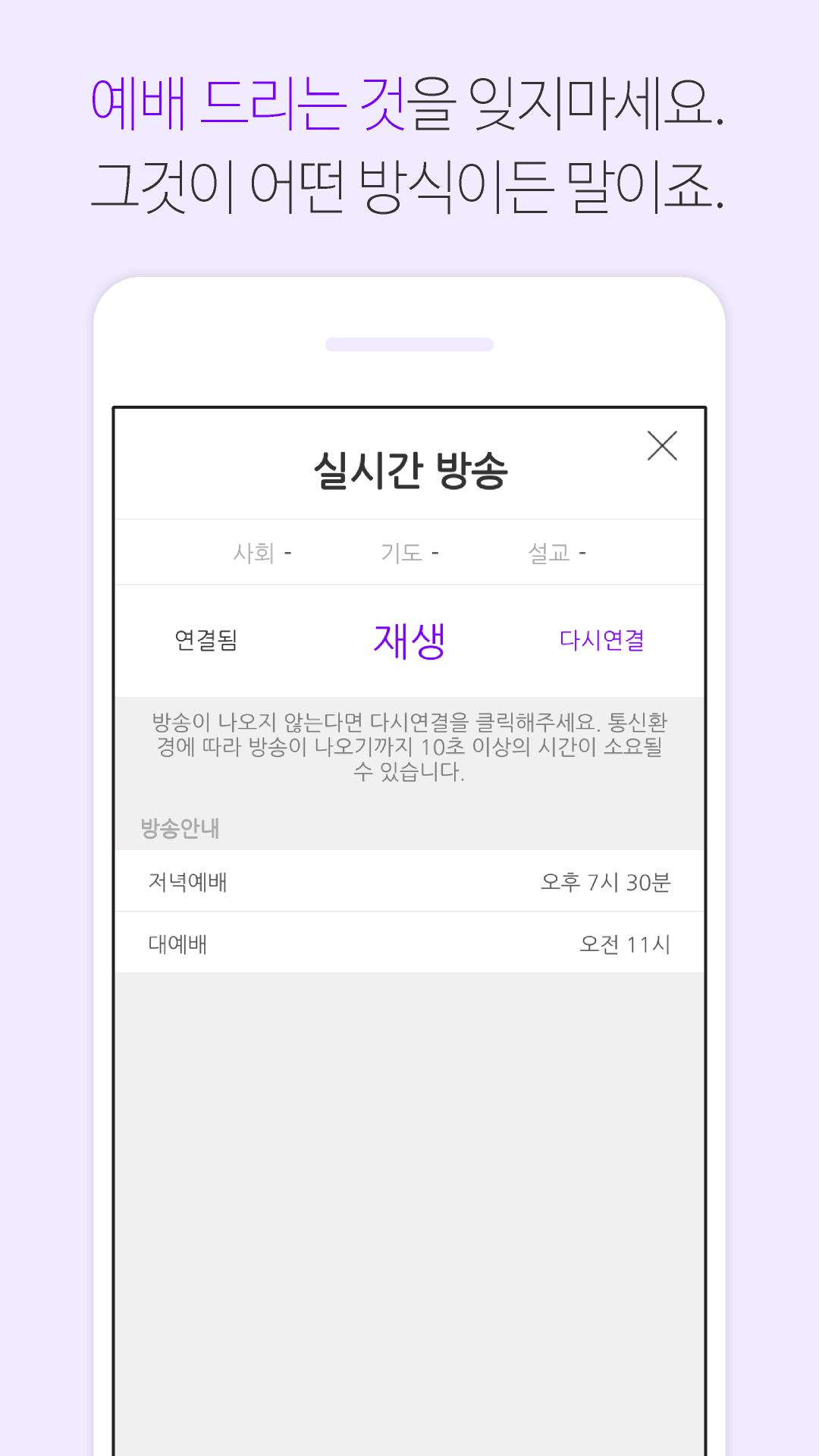 ▶ 예배드리는 것을 잊지 마세요. 그것이 어떤 방식이든 말이죠. 예배가 점점 더 희귀해지는 오늘날, ‘실시간 방송’은 예배를 삶속에서 더욱 가까이 할 수 있도록 도와줍니다. 하지만 기억하세요. ‘실시간 방송’을 통해 예배를 드리는 것은 교회에 직접 출석하는 것의 대안이 될 수 없습니다. ‘실시간 방송’의 목적은 오직 당신을 교회로 인도하는 것에 있습니다.