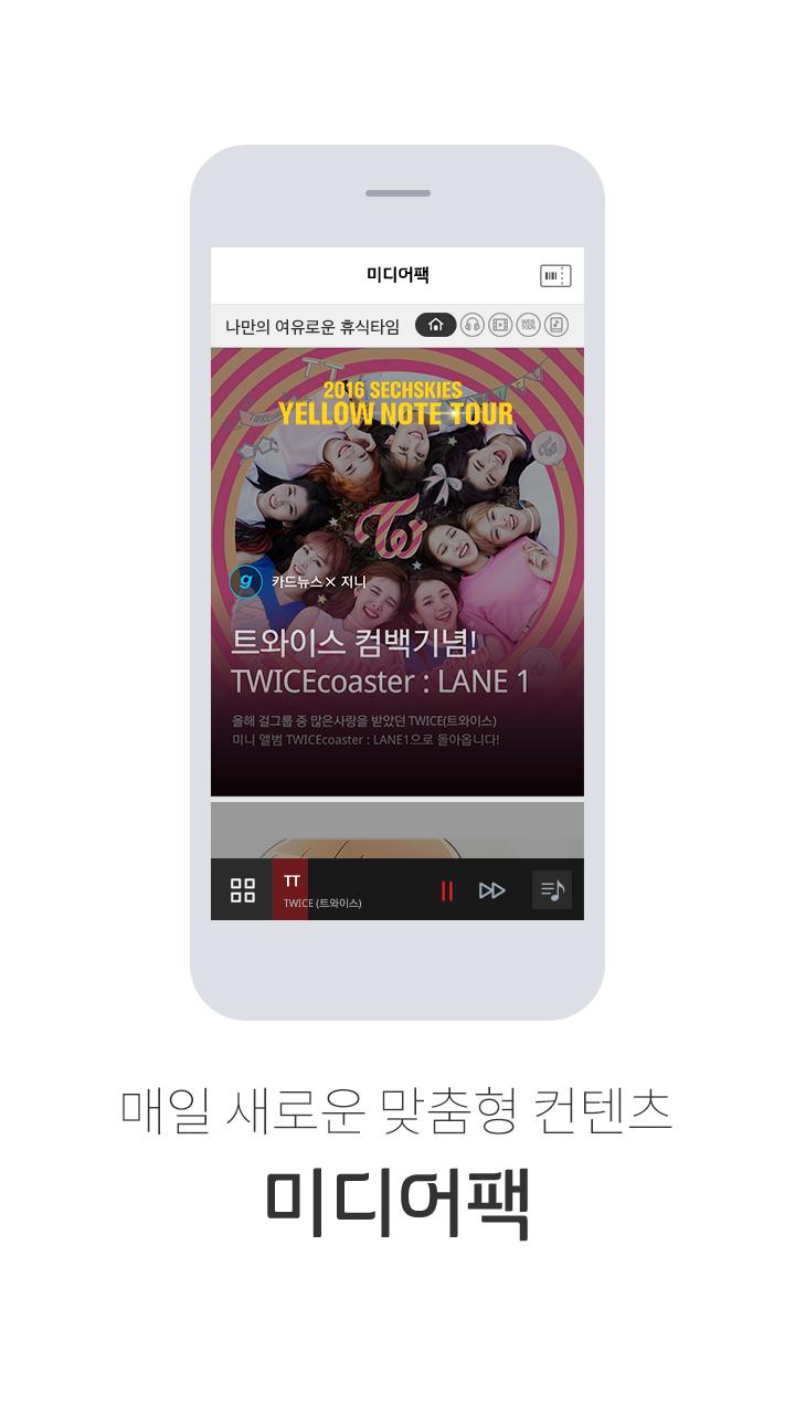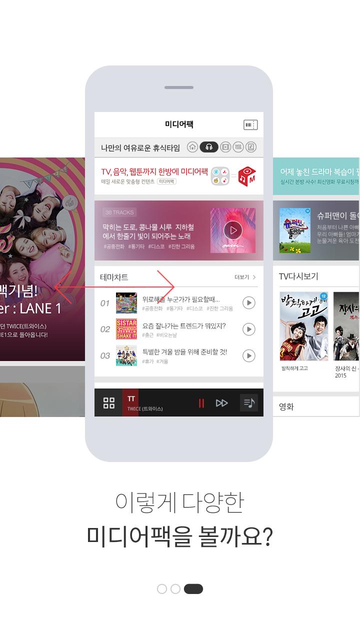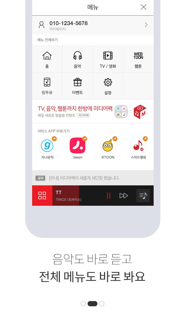 미디어팩 App은 “TV, 음악, 웹툰까지 모두 즐기는 미디어팩 서비스를 한방에! 이용할 수 있는 패키지 App이랍니다