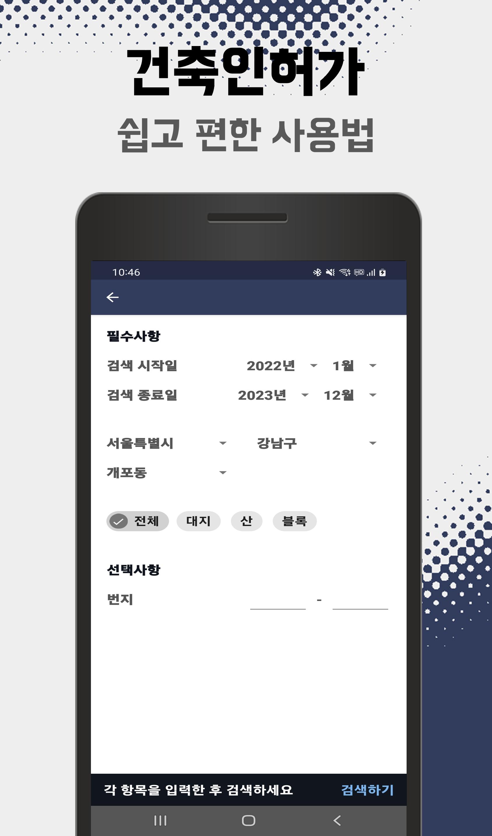 不動産投資や建築計画、または単に気になった建築物の許認可状況!まだ複雑な手順のために躊躇しますか?不動産建築許可アプリは、国土交通省建築HUB建築許可情報サービスAPIに基づいて、韓国のすべての建築許可情報をログインせずに住所だけで簡単かつ迅速に確認できるようにする革新的なサービスです。 今度は面倒なプロセスなしに、いつでもどこでも必要な建築情報をすぐに確認してください!