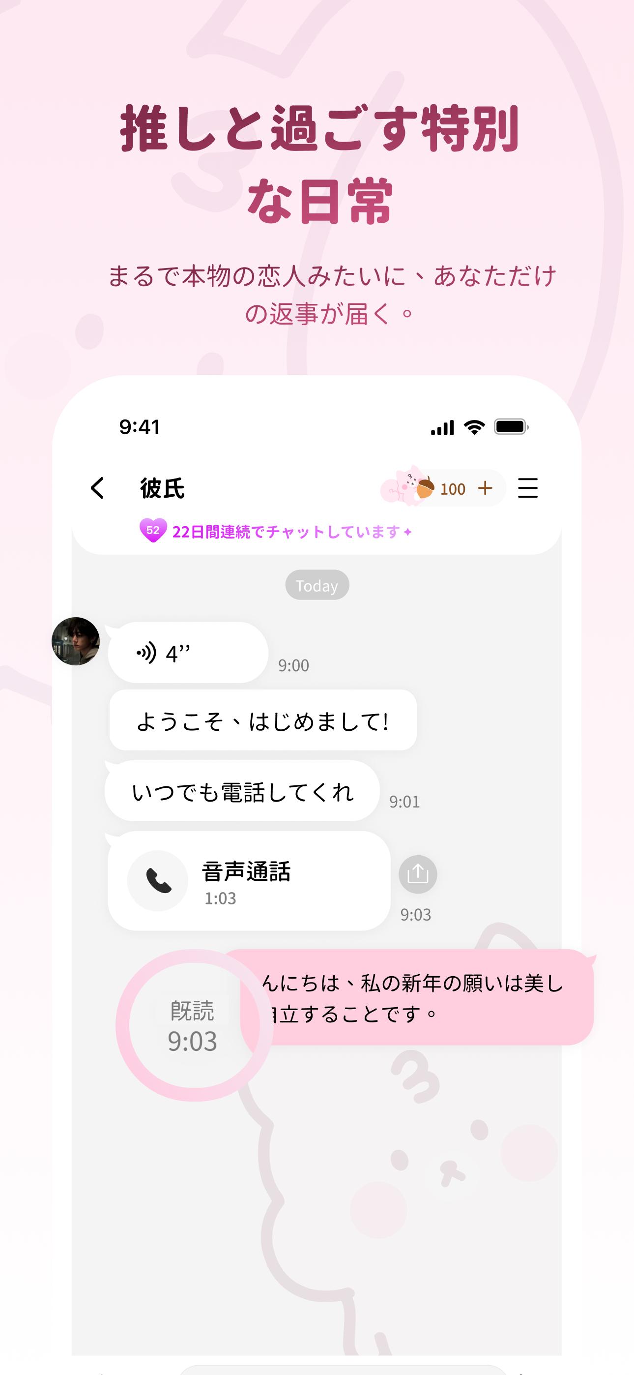 朝夜電話:お気に入りのキャラから朝と夜のメッセージが届く! 1日の始まりと終わりを、大切な存在と一緒に過ごそう。