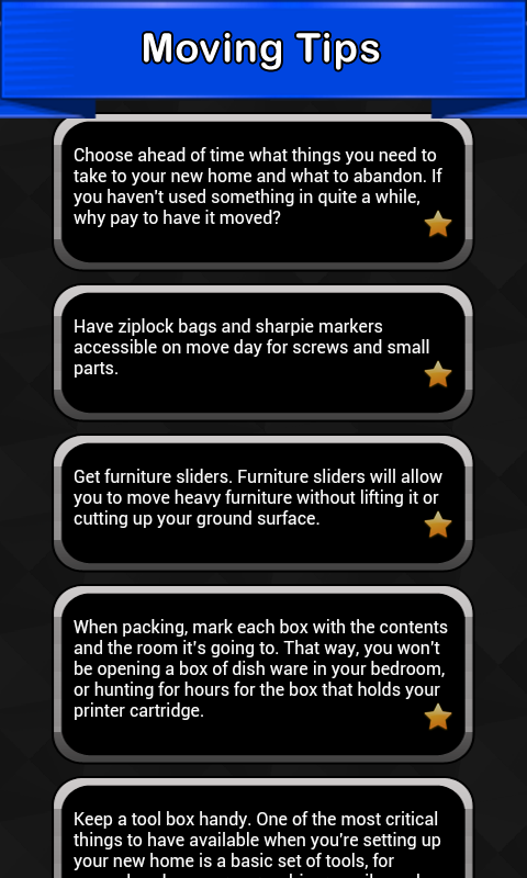 Are you looking for the best collection of Moving Tips for your mobile device? This app is filled with packing tips for moving out, traveling a long distance, and how to move across country to a new house or apartment. Learn tips for moving out of state, how to pack your things, stay safe in your travel, rent a moving truck and have a successful moving day. Find out how to make a checklist, label boxes, easy ways to move furniture, and get your friends and kids involved in the process. Download and install this free moving tips app and make your move day easy and fun.Last updated on 2016年04月15日