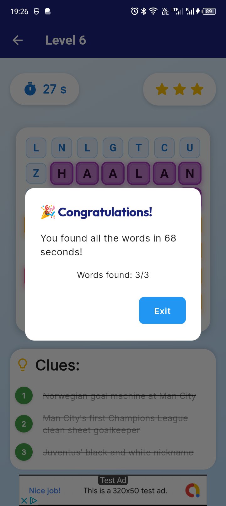 🔍 ワードハントモード - 散らばった文字のグリッドに隠された単語とヒントを探し出しましょう。100 の難易度の高いレベルで、時間との競争を繰り広げ、最大 3 つ星を獲得しましょう。