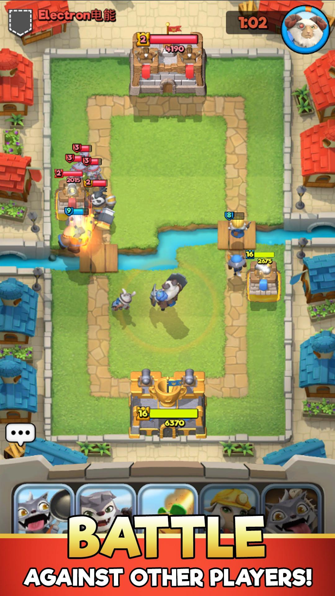 このゲームのメインであるバトル!集めたカード8枚でデッキを作って、リアルタイムで敵プレイヤーと戦います!目標は敵の城を破壊することもしくは、時間切れになったときに最もジェネレーターを捕捉したプレイヤーになることです! 動物達の戦闘ショーが今始まる!