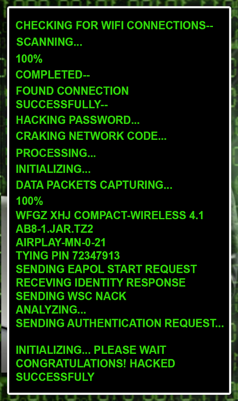WiFi password Hacker Prank creates the illusion that it can hack into secured wireless networks protected with AES, WPA2 or WPA encryption.It does not actually harms or breaks into wireless networks.